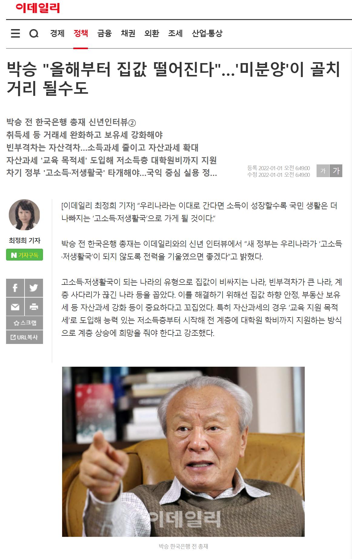 이 분이 따지자면 보수적인 경제 학자/관료인데, 합리적인 사고로 한국의 경제를 전망하면 이런 결론에 다다를 수 밖에 없다. 이념과 진영주의에 빠져서 뻔히 보이는 것도 보지 않는 학자나 정치인들이 문제다. 특히 마지막 문단이 강렬하다. "경제가 성장하고 소득이 증가할수록 국민 생활이 윤택해지는 ‘고소득·고생활국’이 되도록 했으면 좋겠다. 고소득·저생활국이 되는 네 가지 유형이 있는데 이를 해결하면 된다. 첫 번째는 집값이 비싸지는 나라다. 집값 안정책이 필요하다. 두 번째는 빈부격차가 큰 나라다. 소득 재분배 정책을 강화해야 한다. 세 번째는 계층 상승의 희망이 없는 나라다. 계층 상승의 사다리는 교육이라 빈부격차 관계 없이 능력 있는 젊은이가 대학원까지 교육을 받을 수 있도록 전 교육비를 정부가 부담해야 한다. 능력이 부족하면 저소득층부터 실시해 교육의 사회화를 추진해야 한다. 네 번째는 환경과 생태계가 파괴된 나라다. 지구 환경과 생활 환경을 개선하는 데 정부가 책임지고 나서야 한다. 그리고 이런 정책을 추진할 때 이념·정치·진영을 초월해 국익 우선 실용주의적으로 하길 당부한다." https://www.edaily.co.kr/news/Read?newsId=01216886632193456&mediaCodeNo=257