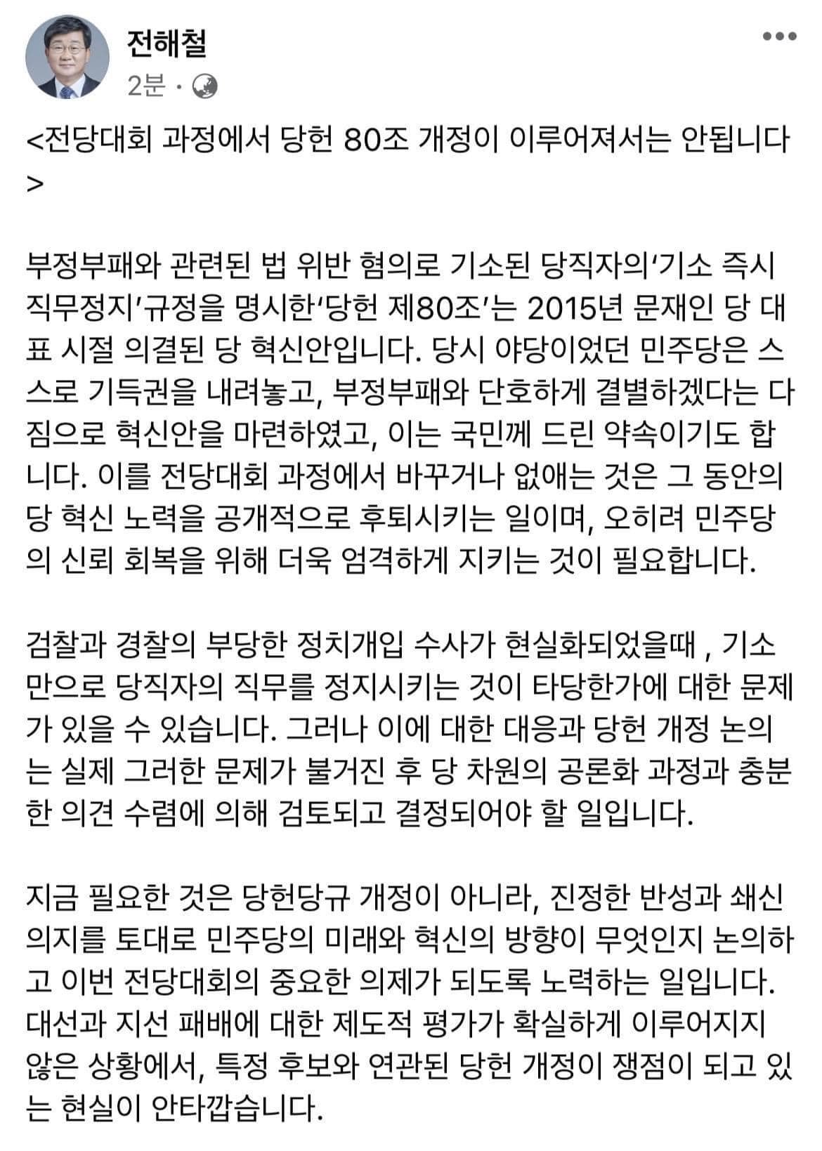 예전과 달리 검찰이 노골적으로 검찰공화국을 만들고 나선 상황에 윤 정권을 상대로 투쟁하는 민주당 대표를 기소하면 현 민주당 당규에서는 바로 대표가 갈려나감. 죄가 있건 없건 민주당 대표직을 유지할 수 있는 사람은 이낙연, 박용진, 전해철처럼 검찰 입맛에 맞는 친낙파로 한정된다는 뜻. 추미애, 이재명, 이해찬 등은 당연히 안되고 대표 시절 문재인 정도 되는 사람도 아마 바로 기소할 것. 전해철은 이런 우려를 인정하면서도 그런 상황이 발생하면 그때가서 생각해보자고 주장. 왜? 이재명까지만 현 당규 적용해서 날려보내고 그 다음에 바꾸자는 뜻. 현관문에 큰 구멍이 난게 보이면 지금 막아야지 "도둑이 들면 그때가서 고치면 돼"가 말이 되나. 민주당에 심어놓은 검찰의 세작이 한 발언이라면 딱 적당하겠는데…