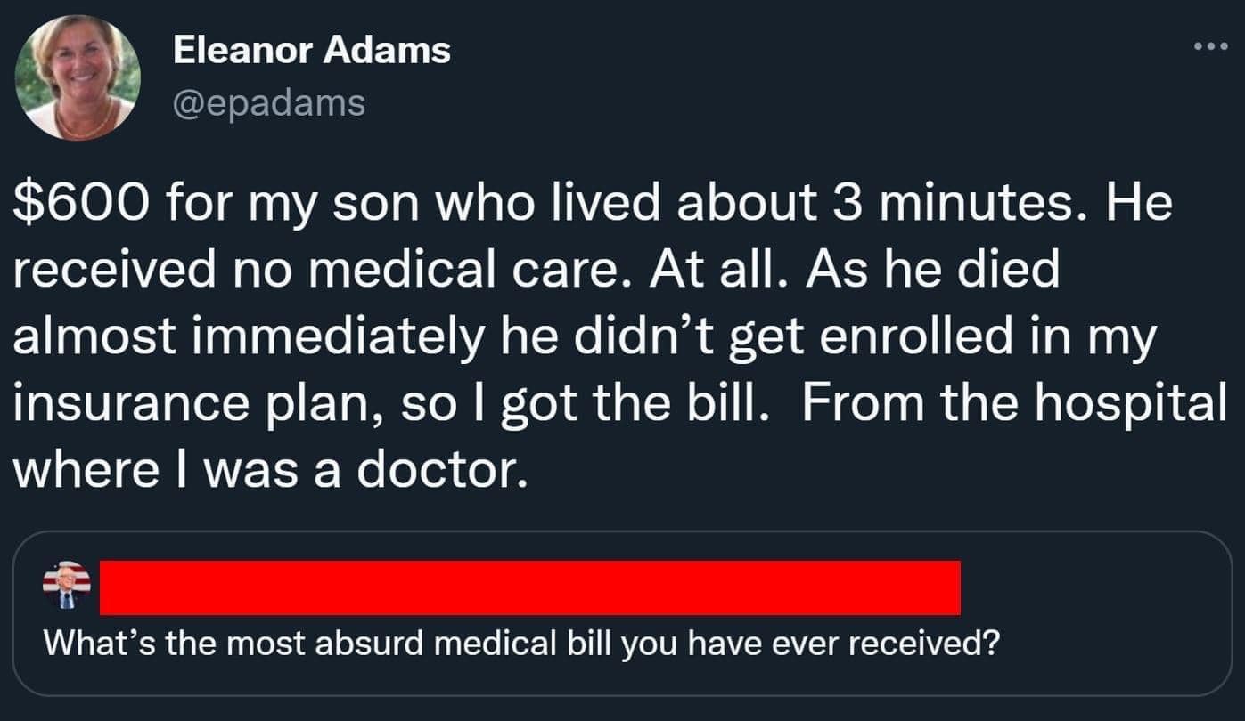 기억나는 가장 황당했던 병원비는? – 3분 정도 생존했던 내 아기 비용으로 $600(90만원). 아무런 의료조치를 취한 건 없었다. 거의 태어나자마자 죽었기 때문에 내 의료보험에 더할 새도 없었고 그래서 비용은 나에게 청구됐다. 그것도 내가 의사로 일하는 병원으로부터.