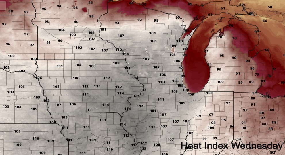 으음? 오늘 최대 예상 기온이… 114F… 45.6C. 어제도 거의 40도였다는데 집에만 있었더니 모르고 지나감… 오른쪽 위를 보면 오대호 부근은 겨우 한시간, 반시간만 운전하고 가도 98F 에서 77F로 떨어지는 곳들이 있음. 섭씨로 12도 차이. 저 가지처럼 튀어나온 갈색 덩어리가 미시간 호인데, 한국(남한) 땅 크기 10만 제곱미터의 절반을 넘기는 5.8만 제곱미터 크기. 워낙 큰 호수다보니 호수가인데 파도가 치고 길고 큰 모래사장들이 만들어져 있음. 물 부피 때문에 기온도 여름에는 주변 내륙보다 시원하고 겨울엔 주변 내륙보다 따뜻한 편. 기후변화에도 비교적 덜 영향을 받을거라고 해서 주목하는 지역이었는데 최근 몇년은 북극 소용돌이가 돌아서 별 의미가 없어진 듯… 지역 자체가 너무 추워지는 경우가 늘고 있음. 여름엔 훨씬 뜨거워지고. 나름 살기 좋은 지역들이 어디인지 항상 주시하는 편인데 점점 리스트가 줄어들고 있음.