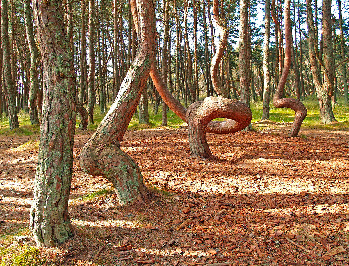 1. 폴란드 북서지역에 있는 숲. 주변 숲은 멀쩡한데 저기 나무만 낚시바늘 모양으로 자람. 2. 러시아 칼리…
