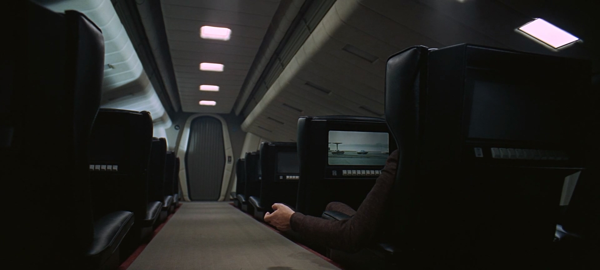 [2001년 스페이스 오디세이]의 재미있는 점 또 하나. 영화 속 스페이스 셔틀 내부 모습에 모니터 화면, 머리 위에 짐칸, 등은 영화가 만들어진 60년대에는 아직 없던 것. 그땐 비행기 안이 지금에 비해 더 텅 빈 느낌이었음. 영화 배경인 2001년쯤부터 화면이 본격적으로 도입되기 시작. 30-40년 뒤 항공기가 그 모습을 거의 그대로 따라하게 될 만큼 세세한 부분까지 말이 되는 디자인을 고집했던 영화.