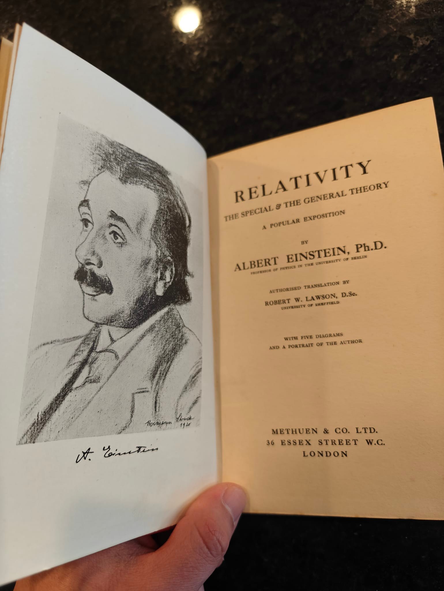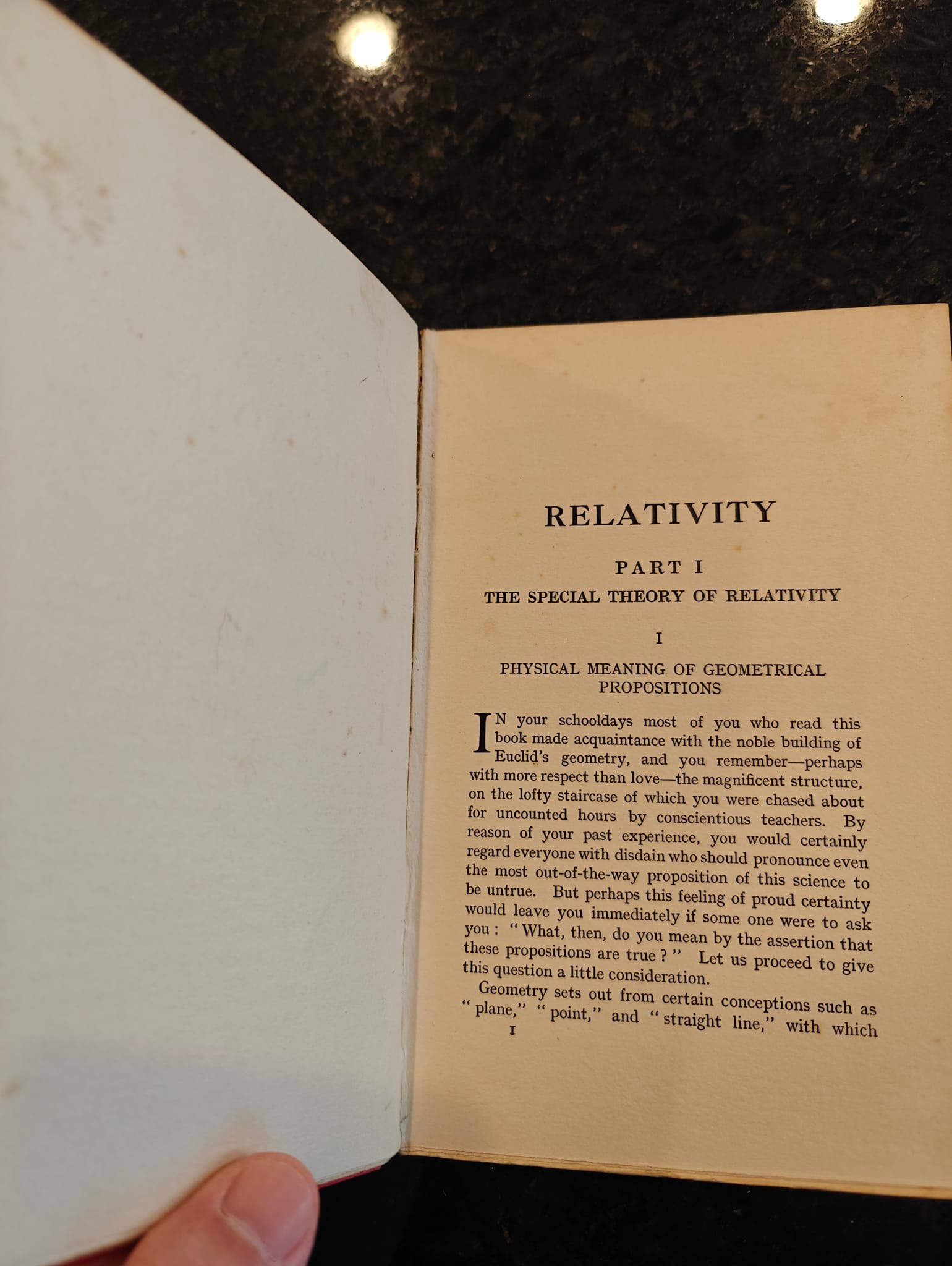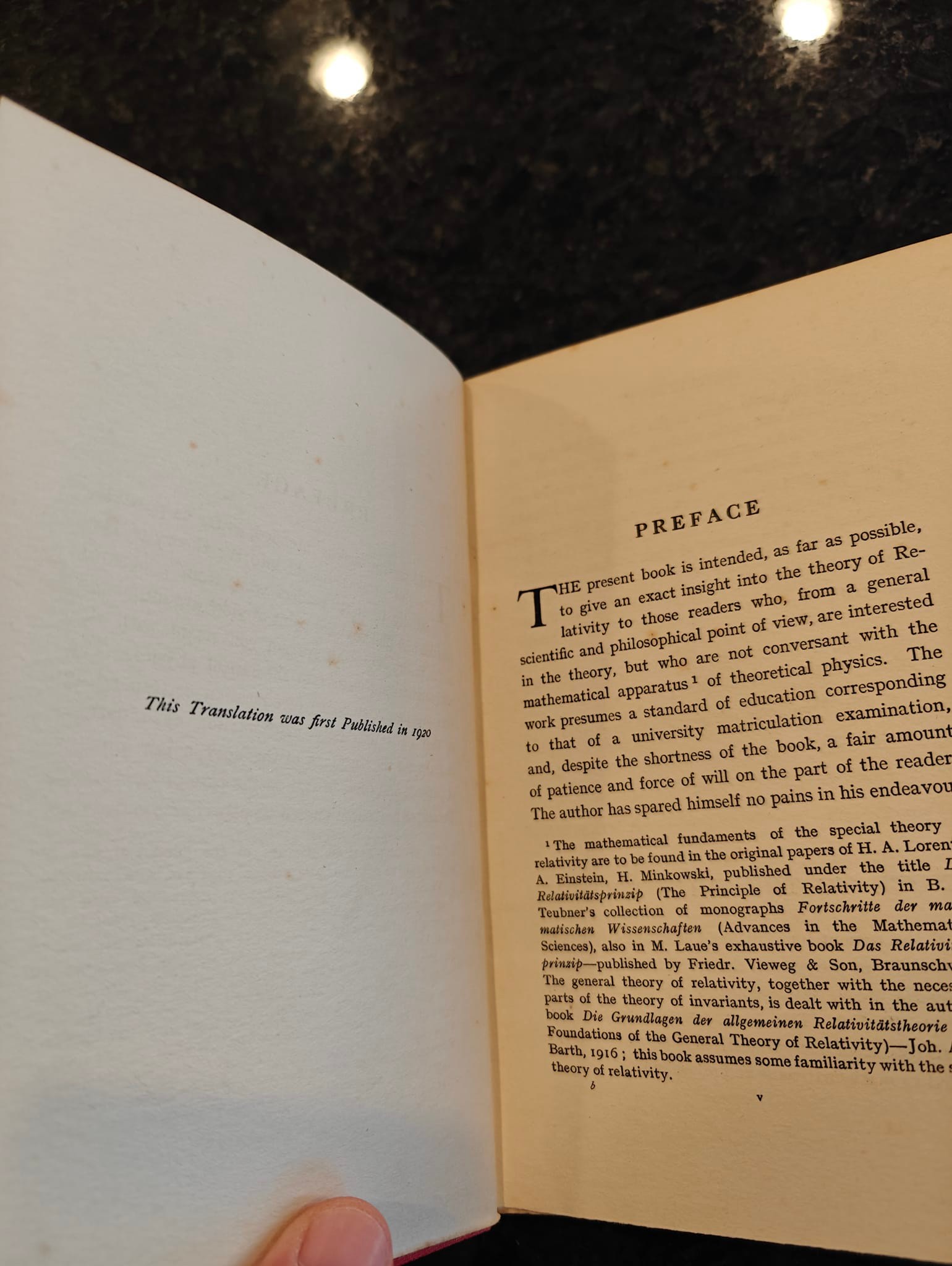 눈에 띌 때 하나씩 모으는 19-20세기 책들. 오늘은 1920년도에 처음 발간된 상대성이론 영문판 1쇄가 들어오심. —- 1920년대는 현대 과학에 엄청나게 충격적인 시간이었다. 우주탐사, 컴퓨터, 첨단의학기술, 모두 1920년대에 이뤄진 근본적인 과학적 성과에 바탕하고 있다. 하늘에 희미한 별처럼 보이는 것들이 사실 대부분 우리 은하와 비슷한 또 다른 은하들임이 밝혀졌고, 모든 은하가 서로로부터 멀어지고 있다는 것도 밝혀진다. 해서 빅뱅 이론 탄생. 양자물리학도 이때 정립된다. 꼭 새시대가 열림을 알리듯 아인슈타인이 먼저 1905년에 정리한 특수상대성이론과 1915년 일반상대성이론을 발표하고 거기에 영감이라도 받은 듯 모든 분야에서 눈부신 발전이 이뤄졌다. 이 책은 1920년에 특수/일반 상대성이론을 한번에 영문으로 번역해 런던에서 처음 발간한 책.