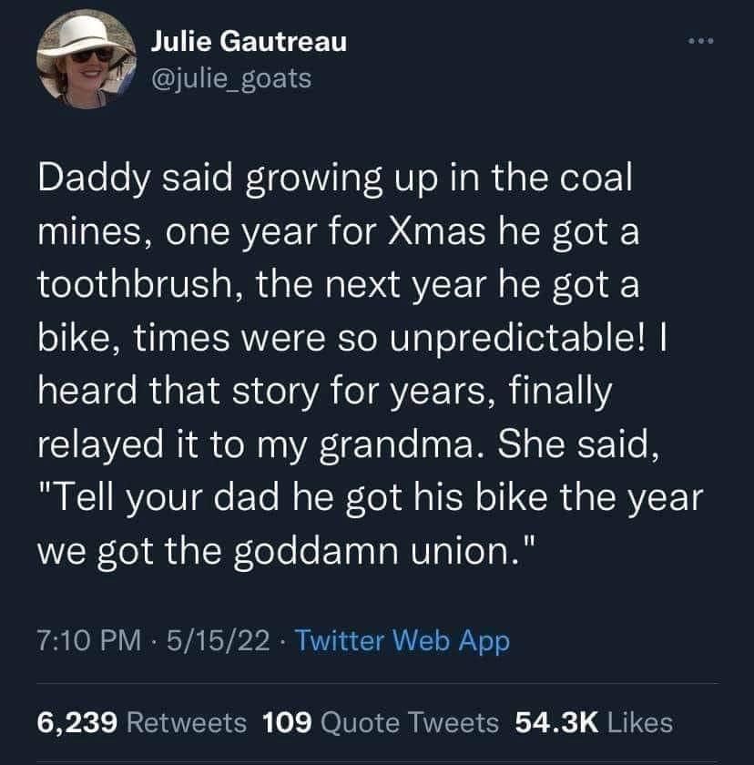 "아빠는 탄광촌에서 자랄 때 한해는 성탄절 선물로 칫솔, 다음해는 자전거를 받거나 해서 가정형편이 급격히 오르락내리락 했었다고 말하곤 했다. 할머니에게 물어보니 '가서 아빠한테 전해. 자전거 사준 해가 마침내 노조결성에 성공한 해였다고.'"