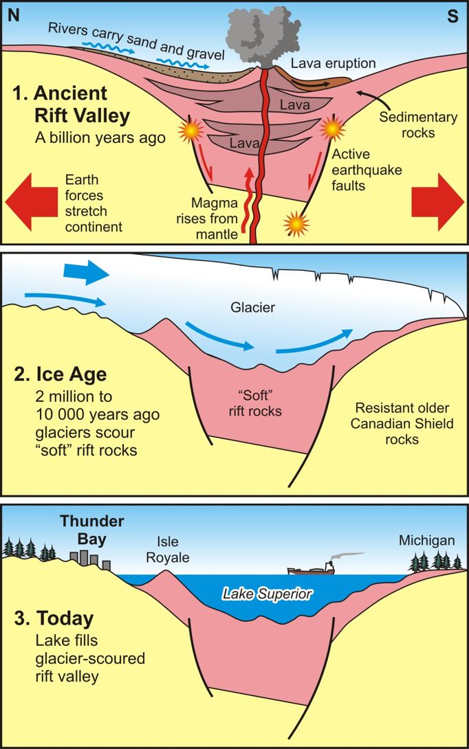 북미 오대호 중 가장 크고 수심이 깊은 수피리어 호수 수심이 405m. 먼저 지각 판이 서로 멀어지는, 지구 표면에 깊은 균열이 생기는 곳에 마그마가 올라오며 비교적 부드러운 암석으로 채워진 후, 빙하가 그 위를 지나가며 그 부드러운 암석을 싹 긁어내고 녹으며 채워진 게 오대호. 미시건 호에 호수 크루즈 가면 빙하에 긁힌 암벽을 볼 수 있음.