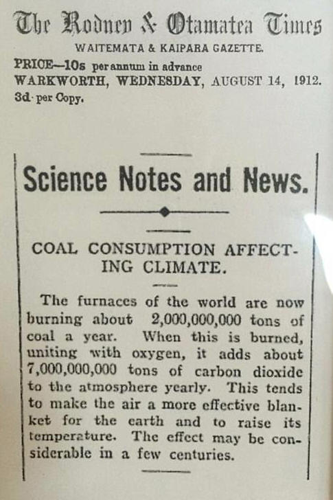 진위 논란이 있었지만 진짜로 판명. 화석연료 때문에 기후변화가 생기고 있다는 최초의 신문기사. 1912년 8월 14일. 111년 전. 연관은 없지만 같은 해에 성철 스님, 김일성, 튜링, 최순실 아빠 최태민, 신자유주의 경제학의 거두 밀튼 프리드먼, 등이 탄생. 일본은 메이지 천황이 죽어서 메이지 시대가 끝나고 다이쇼가 즉위. 조선은 한참 여기 저기서 의병 조직하고 해외로 독립운동하러 나가고 하던 때.