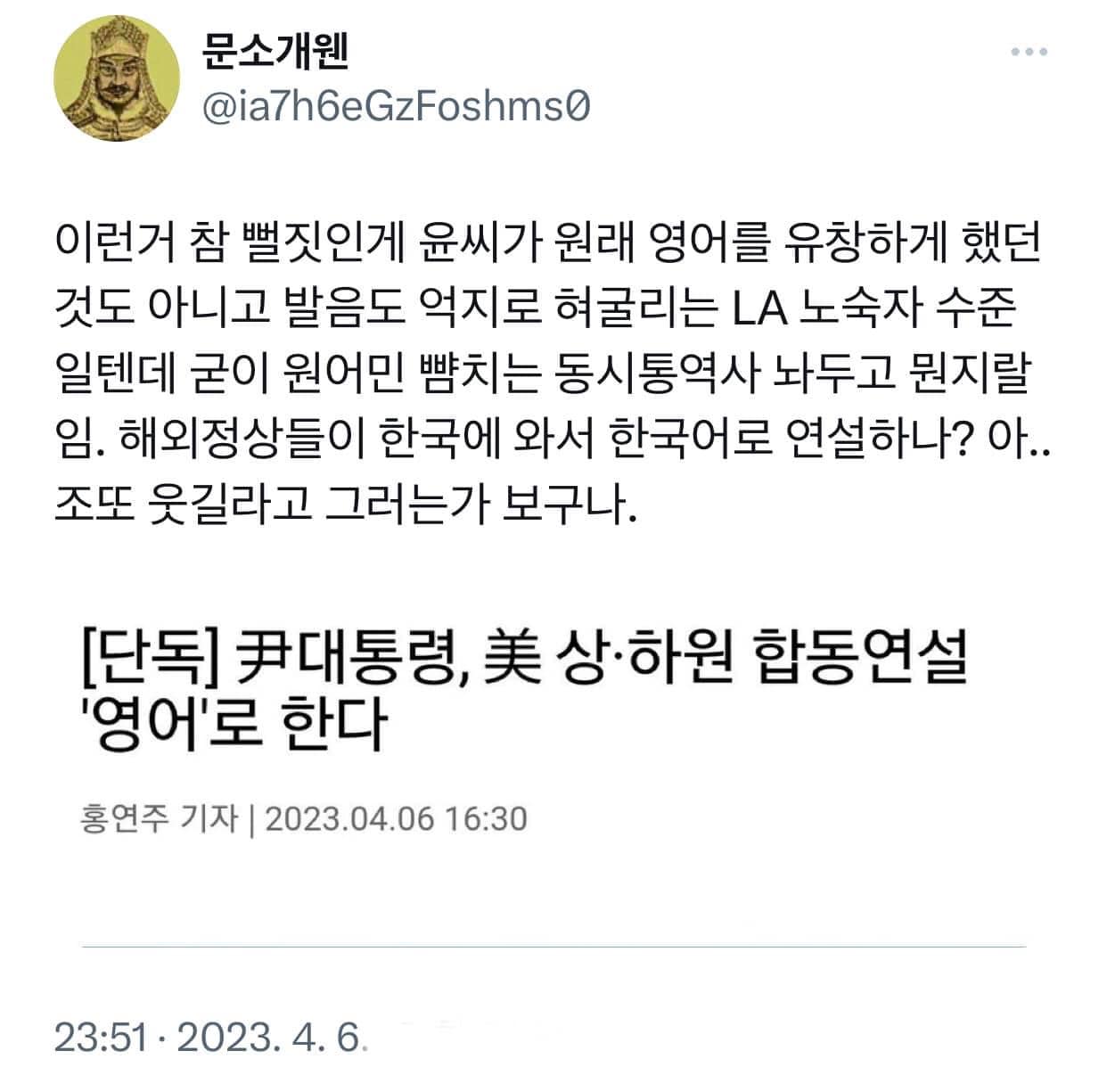 아님. 1. 윤과 거니는 실제로 자신들의 영어 실력이 좋다고 생각하고 있음. 이 사회의 승자들이니까 당연 자신들의 모든게 뛰어나다고 믿고 있음. 2. 일본 가면 일장기에, 미국가면 성조기에 경례하는 윤은 미 의회에 가면 당연 주인님들의 언어를 써주는 게 이쁨받는 일이라고 생각함. 3. 자신의 멋진 잉글리쉬 스피킹을 쇼케이스하면 친일과 양곡법 거부로 박살난 국내 지지율도 다시 올라갈 거라고 생각하고 있을 것.