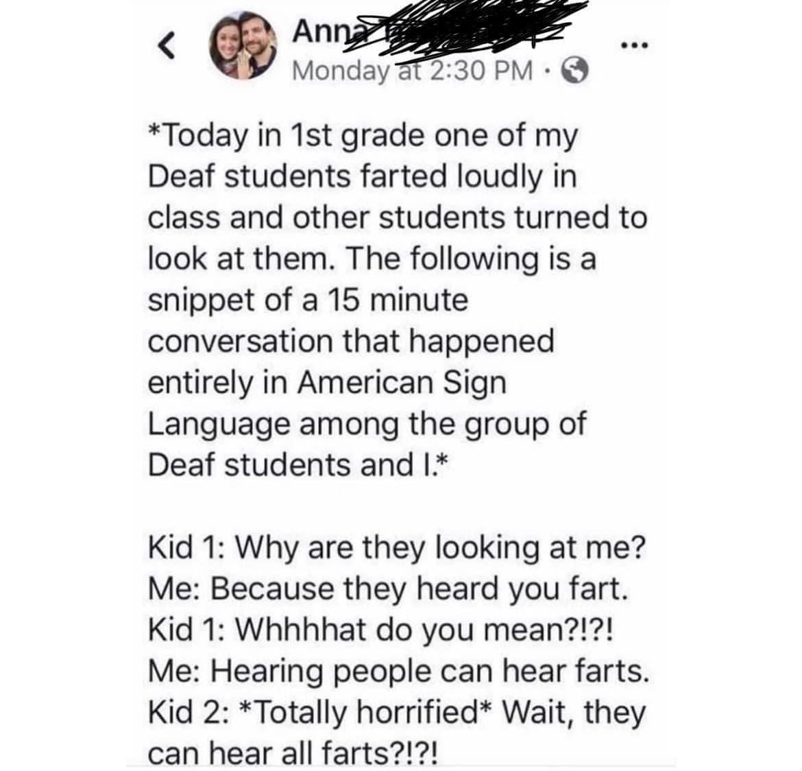 “오늘 1학년 반에서 청각장애가 있는 아이가 크게 방귀를 뀌었고 다른 아이들이 다 그 아이를 향해 돌아봤다. 아래는 그 뒤 내가 수화로 반에 모든 청각장애인 아이들과 15분간 나눈 대화의 요약본이다. 아이1: 왜 다들 나를 봐요? 나: 니가 방귀뀐 소리를 들었거든. 아이1: 뭐어어어요?!? 나: 귀가 들리는 사람(聽人)들은 방귀소리를 들을 수 있어. 아이2: *완전 패닉* 아니 잠깐, 모든 방귀를 다 들을 수 있는 거예요?!?!“