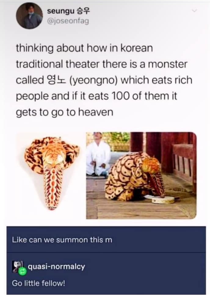 미쿡에 젊은 세대가 부자들에 대한 극도적인 혐오감을 보이는 성향이 있는데, 이들은 각자 자신이 처한 상황에 대해 "월세를 꼬박 꼬박 내야하다니. 집주인들은 모두 죽어야해." 라던가 "월급을 안올려주다니. 모든 고용자들은 죽어야해." 이런 식이다 보니 어떤 하나의 체계적 이념으로 결집되거나 과거의 사회주의 이념 등으로 연결되는 일이 드물다. 그냥 "내 돈 남에게 주는 거 싫어. 남의 돈 내게 오는 거 좋아." 수준을 못 벗어난다. 단결도 의식화도 거부하는 新무산계급이 등장하는 건가, 예전 세대도 원래 다 이랬는데 운동가들이 노력해서 힘을 모았던 건가. "한국 전통극에는 영노라는 캐릭터가 있는데, 부자 100명을 먹으면 승천한다. – 지금 당장 소환하면 안될까 – 힘내라 영노야!"