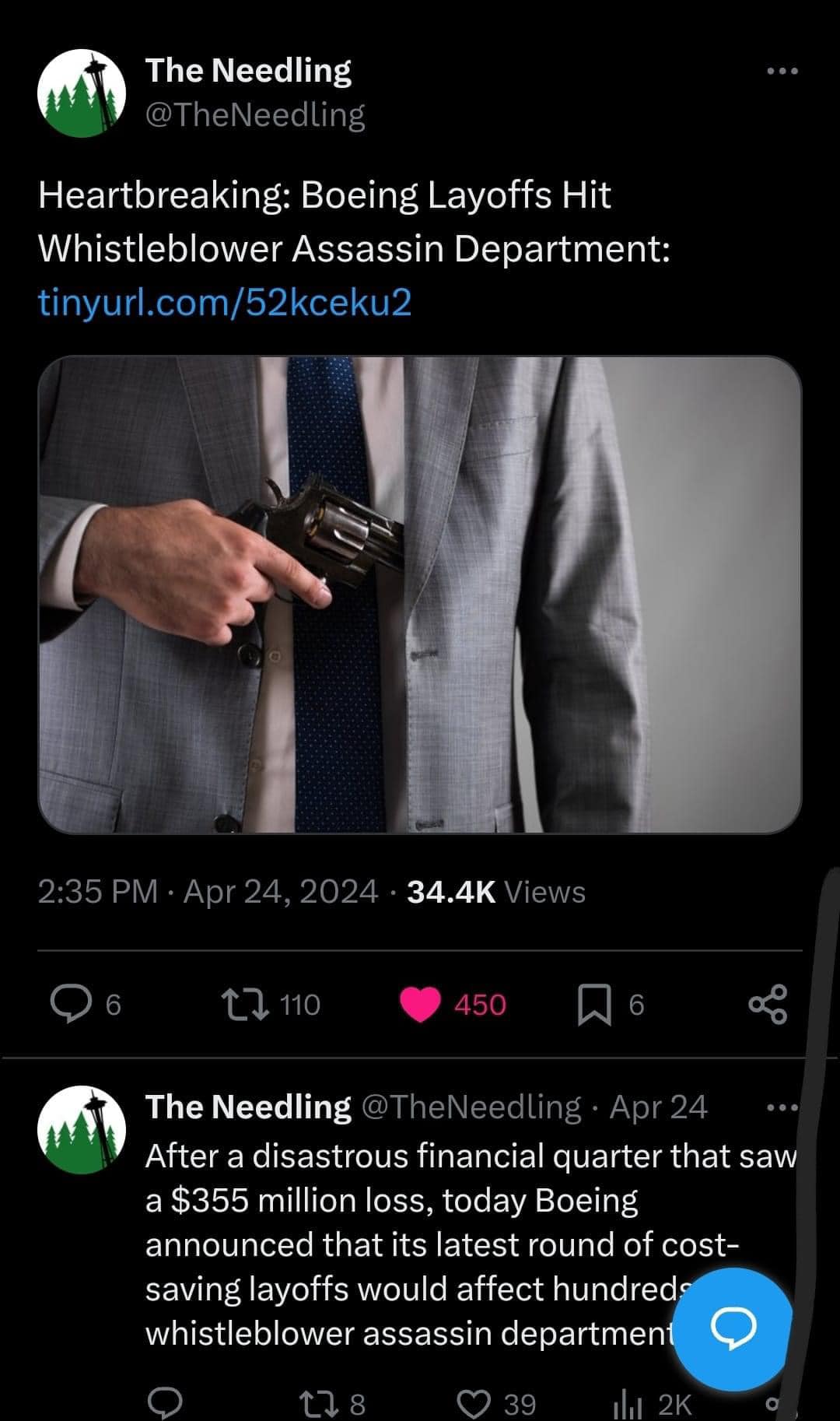 올해 들어 보잉 내부고발자 벌써 두명째 사망… 재무 문제를 겪는 보잉이 내부고발자 처리 자객 부서 인원 감축에 들어간다는 풍자 기사.