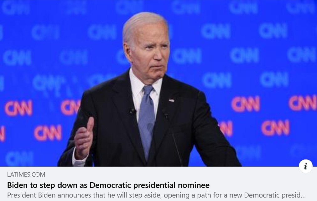미 바이든 대통령 재선 도전 포기 발표. 가장 좋은 그림은 친트럼프 대법원이 대통령의 통치활동은 처벌할 수 없다며 트럼프가 걸린 다양한 소송에 도움주는 판결을 내렸으니 바이든 대통령이 통치행위의 일환으로 트럼프일당을 반란죄로 모든 권한을 동원해 법을 집행하는 것. 그러면 공화당 민주당 모두 새 후보를 내서 공정하게 붙어볼 수 있음. 더불어 대법원 법관 수를 확 늘려 균형을 맞추고 대통령 성향에 조금 덜 영향 받도록 개혁까지하면 적당. 내 예측은 바이든은 아마 그러지 않을 것. 민주주의 국가 전통을 지켰다는 평가를 받고 싶어해서 민주주의 국가 전통을 망치는 트럼프를 잡기 위해 자신도 전통을 어기는 건 거부감이 클 것. 혹은 큰 맘먹고 할 수도 있고. 다음으로 좋은 그림은 막무가내 비호감 1위 트럼프로 굳어진 공화당과 달리 민주당은 젊거나, 신인이거나, 인지도 높고 호감도 좋은 후보를 쇼핑하기 시작할 수 있다는 것. 가장 안좋은 그림은 민주당에 듣보잡 당내 야심가들끼리 다투다 50개 주 전체 투표용지에 못들어가거나 주목 못받고 완패하는 것.