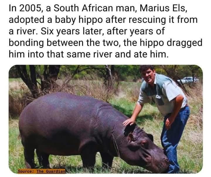 삶을 이성이 주도하게 둘 것인가 감성에게 넘길 것인가가 지난 20년간 핫한 토픽이었는데 나에겐 애초에 말도 안되는 토론이었다. 이성은 남들이 아무도 안 키우는 위험한 야생동물은 애완용으로 두면 안된다고 한다. 감성은 저 하마를 애기때부터 내가 진짜 내 아이처럼 키우면 당연히 하마도 평생 날 주인으로 알아보고 말도 듣고 필요할 땐 날 지켜주기까지 할거다라고 속삭인다. 유튜브에 어릴 때 키우던 사자랑 재회하는 주인 동영상 같은 것도 많은데 왜 난 안돼? 그딴 속삭임 듣는 거 아니다. 그러다 마리우스 엘스처럼 어느날 잡아먹히는 거다.