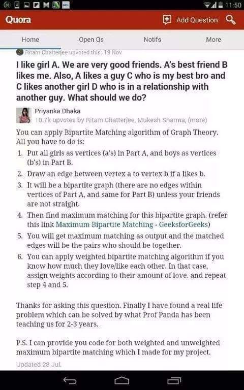 질문: 전 A라는 여자를 좋아합니다. 우리는 매우 좋은 친구입니다. A의 가장 친한 친구 B는 저를 좋아합니다. 또 A는 제 절친인 C를 좋아하고, C는 다른 남자와 사귀고 있는 D라는 여자를 좋아합니다. 우리는 어떻게 해야 할까요? 답변: 그래프 이론의 Bipartite Matching 알고리즘을 적용할 수 있습니다. 다음과 같이 하세요: 모든 여자를 Part A의 정점들(a)로, 모든 남자를 Part B의 정점들(b)로 설정합니다. 정점 a에서 정점 b로, a가 b를 좋아하면 간선을 그립니다. 이 그래프는 bipartite 그래프가 됩니다 (Part A 내부와 Part B 내부에 간선이 없기 때문에, 단 친구들이 양쪽을 다 좋아하지 않는다고 가정합니다). 이 bipartite 그래프에서 maximum matching을 찾으세요. (GeeksforGeeks의 "Maximum Bipartite Matching" 링크를 참조하세요). maximum matching 결과로 매칭된 간선들을 얻게 될 것입니다. 매칭된 간선들은 서로 연결되어야 할 쌍을 나타냅니다. 만약 사람들이 서로를 얼마나 좋아하는지(또는 사랑하는지)를 알고 있다면, weighted bipartite matching 알고리즘을 사용할 수도 있습니다. 이 경우, 각 간선에 "좋아하는 정도"를 가중치로 할당한 후, 4번과 5번 단계를 반복하세요. 이 질문을 해 주셔서 감사합니다. 교수님께 배운 내용을 실제로 활용할 수 있는 문제를 드디어 찾았습니다. 2-3년 동안 공부했던 내용이에요. 추신: 프로젝트에서 작성한 weighted와 unweighted maximum bipartite matching 코드를 제공해드릴 수도 있습니다.