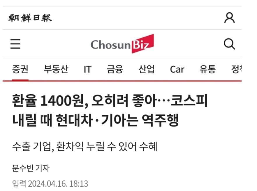 원화 가치가 떨어지면 해외로 물건 수출해서 똑같은 금액의 달러를 벌어도 갑자기 원화로는 수익이 확 늘은 느낌이 들긴하지. 근데 극소수 수출업계 사장님들 빼고 나머지 5천만명이 써야하는 생필품 값은 더 올라가는 건데? 환율 떨어져 전국민 주머니에서 돈이 나가 대기업 주머니로 들어가는 역-낙수효과는 낙수효과와 달리 여러차례 현실에서 증명됨. 조선일보는 그걸 아니까 지금 신난거지.