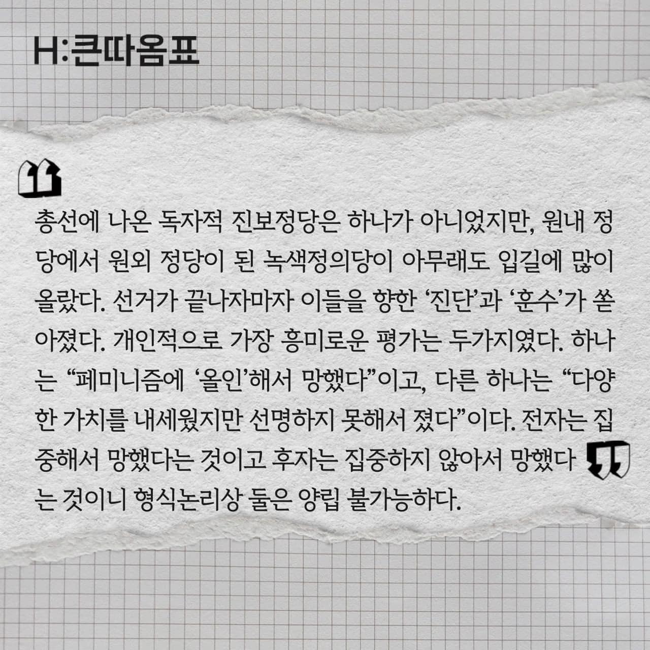 별로 공감 안됨. 그보다는 이걸 생각해보시라. 몇년 전까지 민주진영은 문재인 대통령이 자신을 페미니스트라고 할 정도로 여성주의에 호의적이었다. 이걸 완벽하게 180도 바꿔놓은 게 정의당의 여성주의 무기화 시도였다. 검찰의 힘을 빌어 자신들이 지명하는 민주당 인사는 아무 반격 못하고 생매장되는, 그런 (국힘에게는 절대 못휘두르는, 검찰이 허용하는 범위 안에서만 위력이 있는) 무적의 보검을 얻은 줄 알고 휘둘러보다가 대한민국 여성주의를 침몰시킨 거고 그 과정에서 검찰과 조중동에 종속된거다. 그것도 검찰심판이 시대정신이 된 바로 이 시점에 검찰과 민주당 관련 이슈에 있어서는 국힘의 하청을 받아 표결하는 정당이 됐다. 그렇게 여성주의 이름으로 박원순을 죽였다. 죽은 뒤에도 계속 조롱하며 계속 다시 죽였다. 검찰도 조중동도 국힘도 자신들 편이 되는 놀라운 권력의 달콤함에 취해서, 그래도 되는 줄 알았다. 검찰이 원하는 민주진영 인사만 사냥하는 친검을 해도 미투/여성주의 간판을 달고 하는 거니까 자기들은 친검 아니라고 발뺌하며 계속 민주진보진영 유권자들을 속일 수 있을 거라고 봤겠지. 근데 류-장-심 덕에 여성주의 동력이 급속도로 소진되고 더 이상 여성주의 깃발에 환호하는 여론이 없는 상황이 됐는데 이미 당은 친검이 돼서 계속 검수완박-체포동의 등 정치적 이슈에서 그냥 국힘의 하청정당 모습이 적나라하게 드러난 거다. 더 이상 약발이 없는 여성주의의 가면도 포기하고. 그러니 여가부 폐지 공약을 내세운 윤석열이 당선되면 왜 안되냐는 말을 심상정이 공개적으로 하게 된거고. 그러니 류호정이 이준석을 따라다닌거고. 이 사람들 처음부터 여성주의에 관심 없었다. 검찰독재에 울고 싶은 국민에게 검찰맛 뺨을 계속 날려놓고 0석 받았다고 하소연한다. P.S. 저렇게 자신이 비판하고 싶은 대상의 주장을 왜곡한, 따라서 논파하기 쉬운 허상을 만들어놓고 그걸 비판하는 걸 보고 허수아비 공격의 오류라고 한다. 쓰레기 글이다.