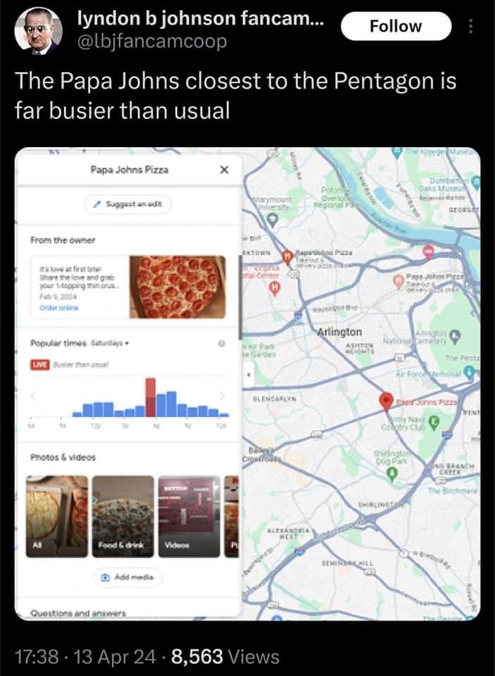미국이 전쟁 수준의 국사작전을 수행하거나 다른 국방 비상사태가 있을 때 국방부 펜타곤 직원들이 집을 못가서 주변 피자 주문량이 확 올라가는 게 통계에서 잡힌다 함. 근데 이번 주말 펜타곤 옆에 피자집에 주문이 불이 나게 들어오고 있다고… 이란-이스라엘 전쟁에 직접 참여할 것인가 배후에서 조종할 것인가.