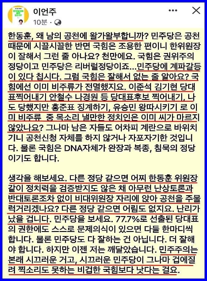 이재명과 이언주의 민주당. —- 민주세력이 200+를 달성하고나면 그동안 쌓인 국민의 분노는 먼저 검찰에 집중될 거고, 검찰이 죽어가는 동안 국힘과 언론은 측면에서 검찰을 지원하고 민주당을 교란하는 것 외에 특별한 저항 수단이 없다. 그럼 그동안 민주당 대상으로 매번 효과적이었던 공격 전술을 반복할 수밖에 없다. 민주당에 가장 개혁적인 인사들을 대상으로 무차별 의혹제기하면 한겨레경향과 민주진영 내 일부가 호응하며 다함께 '손절'하는 방식. 조국, 이재명, 김남국, 손혜원, 정봉주, 곽노현, 노무현, 김경수, 송영길 모두 같은 방식으로 공격당했다. 황당하지만 이 전술이 가능한 유일한 이유는 민주진영 내에 반개혁 세력들 상당수가 진보주의 가면을 쓰고 민주인사 공략에 동참하기 때문이다. 이상민이나 설훈이 이들에 대해 조중동과 함께 공격하면 사실 민주진영에서는 아무도 듣지 않는다. 정의당 쓰레기들과 박지현, 한겨레경향 같이 진보주의를 표방하는 가짜들이 진보가치와 맞지 않는다며 공격해야 민주진영 지지자들이 헷갈려하기 때문에 조중동도 이들의 목소리를 증폭시켜준다. 처음 몇번은 조중동과 국힘 탓을 했지만 이렇게 반복해서 수차례 똑같은 방식으로 당하는 건 저쪽보다 우리 내부의 책임이 더 크다. 민주당의 이 인습을 끊어야 한다. 명분과 엄중 뒤에 숨어 국민의 개혁 열망을 왜곡하던 기존의 민주당이 아닌, 악을 응징하고 제압하기 위해서는 전혀, 전혀 민주당스럽지 않은 사람이라도 데려다 쓰고, 의도가 뻔한 공격은 비웃어주고 무시하는 민주당이 돼야 한다. 이재명 대표는 이미 누군가가 "아무리 그래도 이언주라니.."라고 해도 눈하나 깜짝하지 않는다. 사실 지나고나서 보면 위에 말한 적폐들의 공격에 가장 효과적인 대응은 진짜 전투력이 있고 국힘 변두리에서 대윤 투쟁을 하고 있던 이언주를 데려오는 거였다. '완벽한 진보주의자처럼 인식됐지만 사실 99.999% 밖에 완벽하지 않아. 여기 0.001% 허물을 찾아냈으니 함께 비난하자' 같은 전술은 이언주같이 전혀 진보적이지 않고 전혀 민주당에 어울리지 않는 악랄한 인물에게는 아무런 효과가 없다. 민주진영 내의 꼰대들도 '쟤는 애초에 깨끗한 적이 없어서 더럽다고 공격하는게 무슨 의미가 있나'하고 자포자기 한다. 민주당을 이런 인물들로 채우자는 게 아니라 이런 인물들을 면역주사로 활용해 항체를 만들어야 한다는 뜻이다. 우리 체질 개선을 위해.