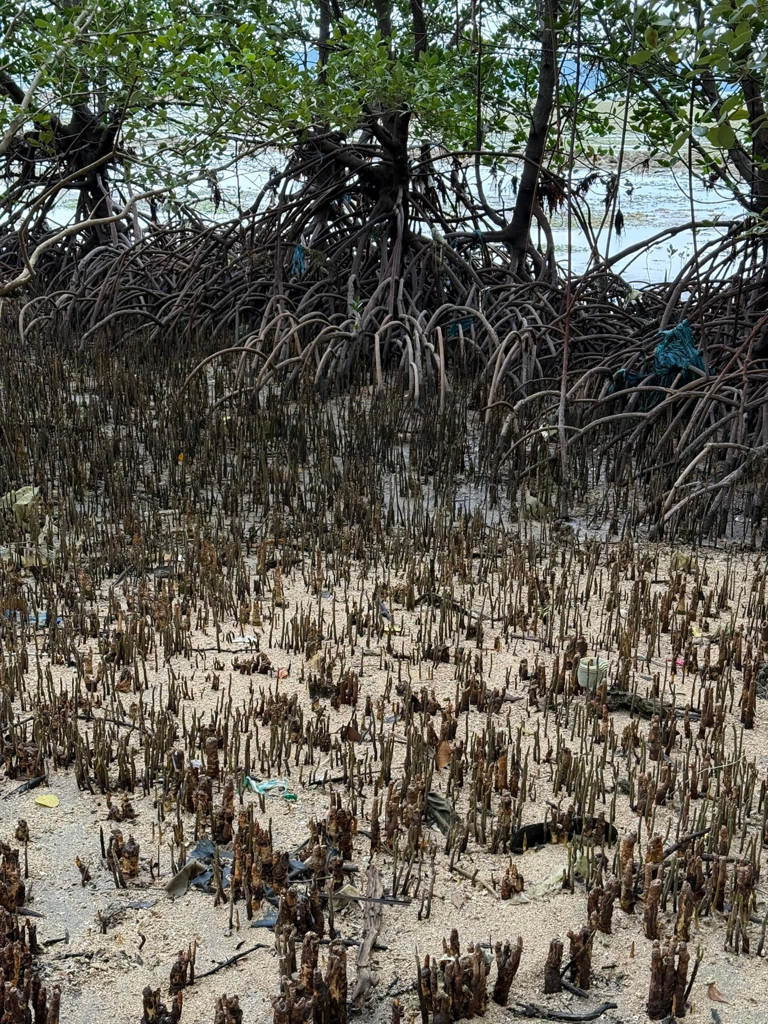 갯벌에 이런 흙무더기가 보이고 작은 구멍들이 있으면 갯지렁이가 사는 곳이다. 모래를 삼켜 그 안에 유기물을 섭취하고 깨끗하게 필터된 모래를 쏟아놓아 갯벌을 계속 청소한다. 저렇게 파고 들어간 구멍은 갯벌에 산소를 공급해준다. 그 옆에는 맹그로브가 있다. 바닷가 젖은 땅에 살다보니 저렇게 뿌리를 땅위로 내밀어 호흡한다. 이렇게 뿌리가 복잡하게 자라다보니 물결의 흐름을 방해하고 작은 생명체들이 서식할 공간을 만들어주며 토양 침식까지 막아준다.