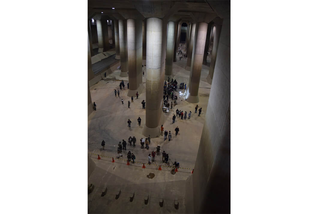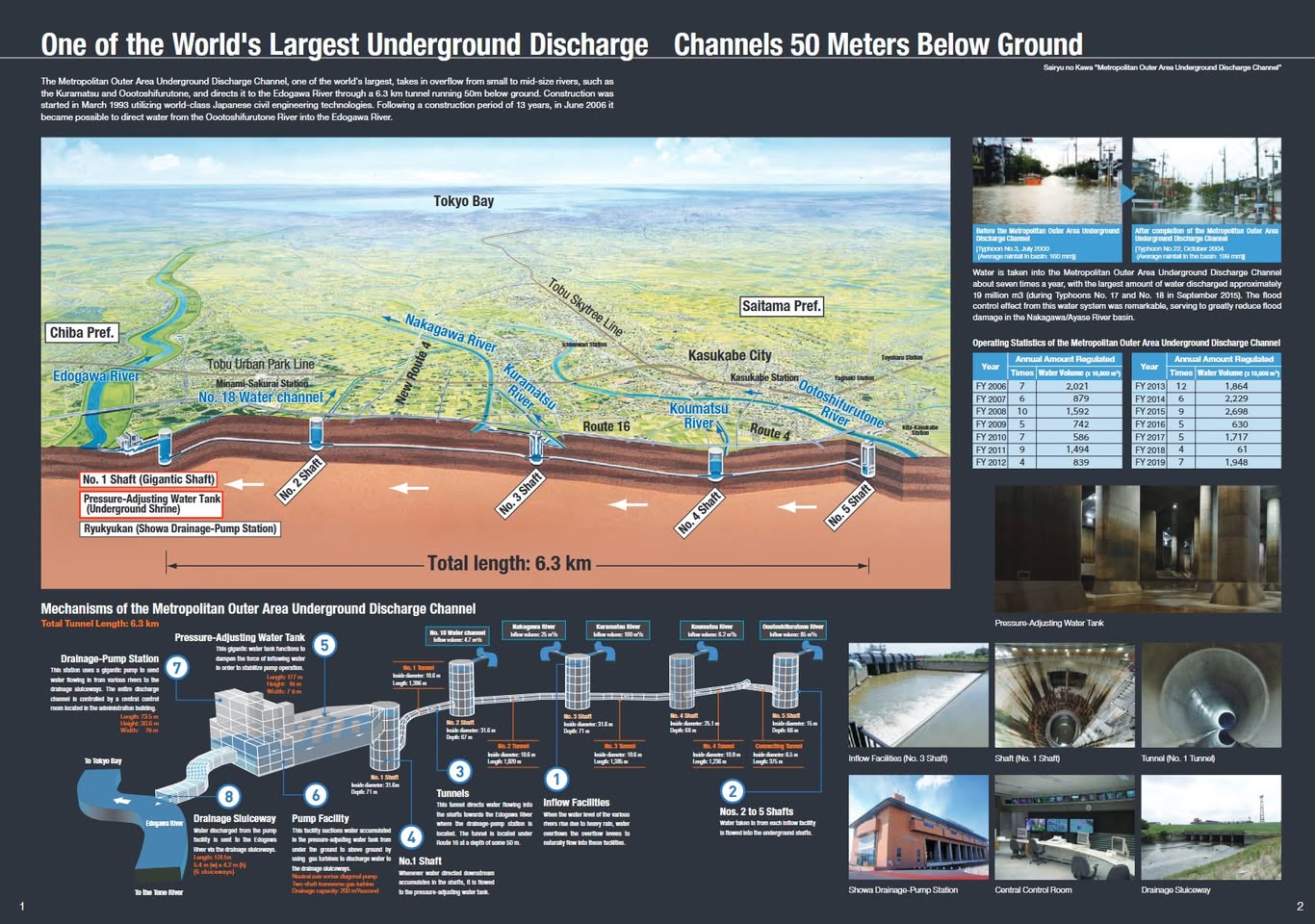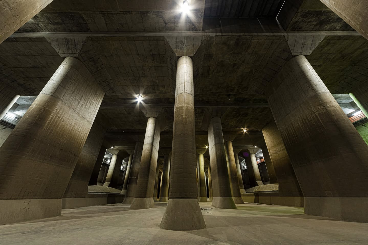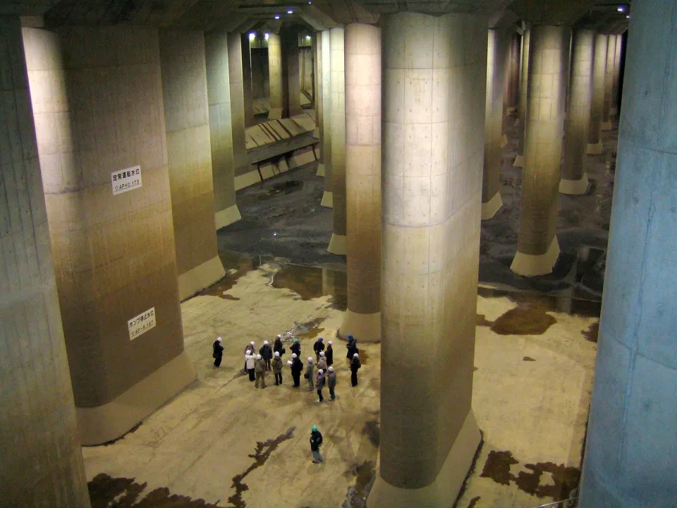 일본 도쿄 지하에 배수 처리 저장공간인 수도권외곽방수로 首都圏外郭放水路. 높이 65미터 지름 32미터의 원통 다섯 개를 6.4킬로미터의 수로들이 연결하고 있다. 거기 모인 빗물이 다시 여기 기둥 많은 저장고에 모였다가 강으로 배출된다. 세계에서 가장 큰 지하 빗물 처리장이고 도쿄에 홍수를 막아준다.