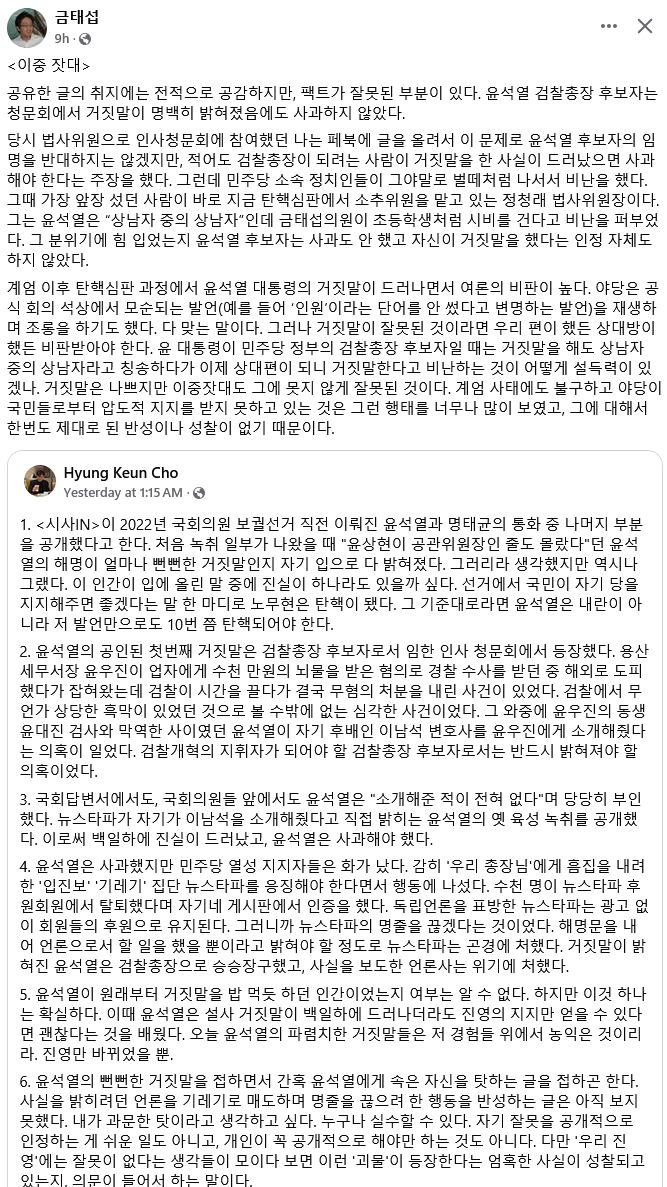음.. 누가 더 윤석열에 대해 비판할 자격이 있는지 비교를 해보자.. [윤석열을 잘 모르던 시절 반부패수사 전문가로 알고 영입하려 노력했으나] -> [나중에 실체가 드러난 뒤에 끌어내리기 위해 열심히 싸운 민주당의원들] vs [처음에 윤석열에 대해 사과해야한다고 주장했으나] -> [실체가 드러난 뒤에 윤석열에 영입돼 전략기획실장을 했고 그 당 서울시장 보궐선거 공동선대위장을 했으나 이제 와서 관계없는 척 하는 금태섭] .. 그만하자.