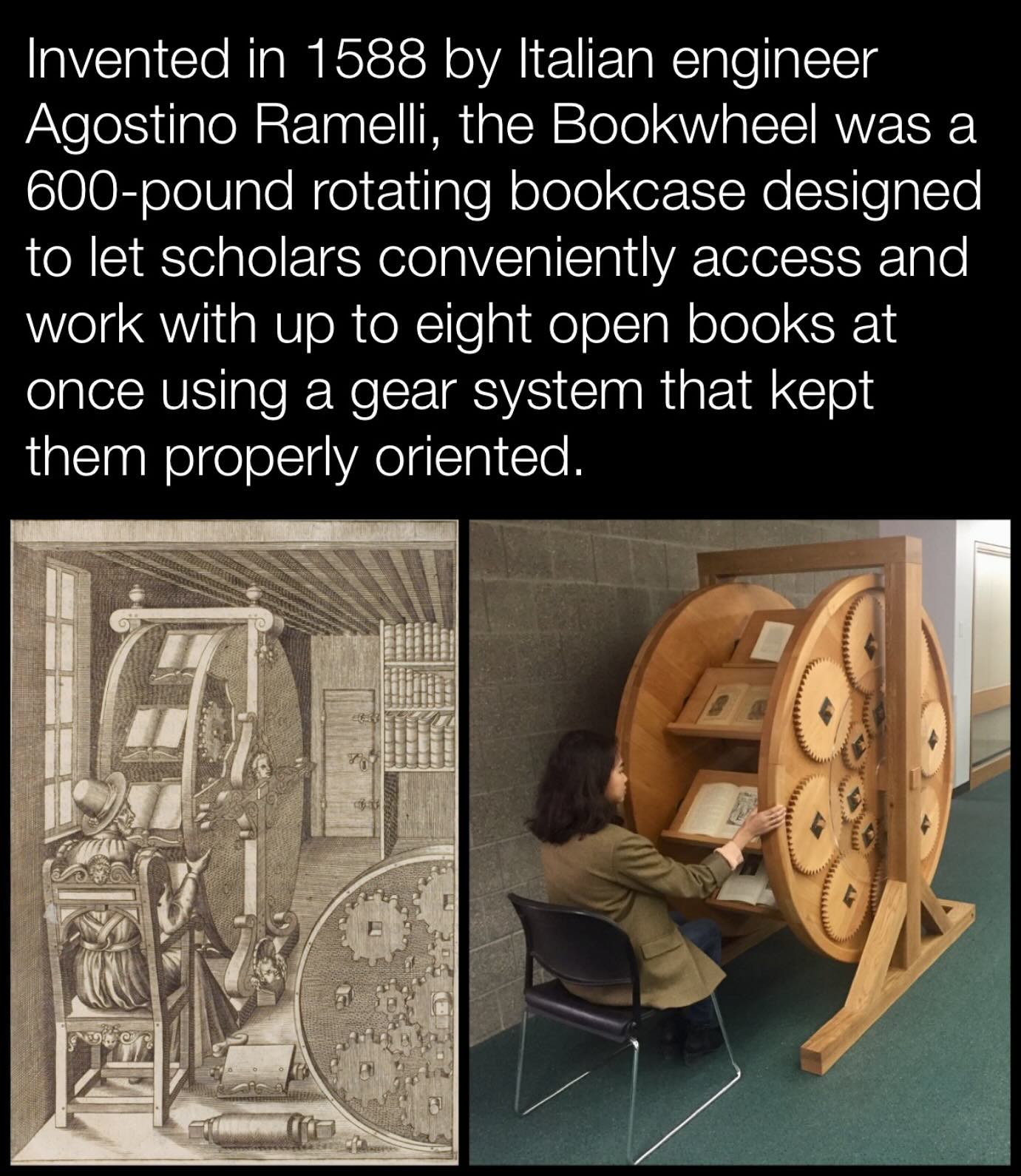 1588년 이탈리아 공학자 아고스티노 라멜리의 물레방아 독서기. 동시에 8권까지 펴놓고 읽을 수 있게 돌아가면서도 각도 유지.