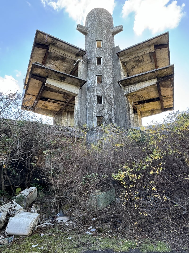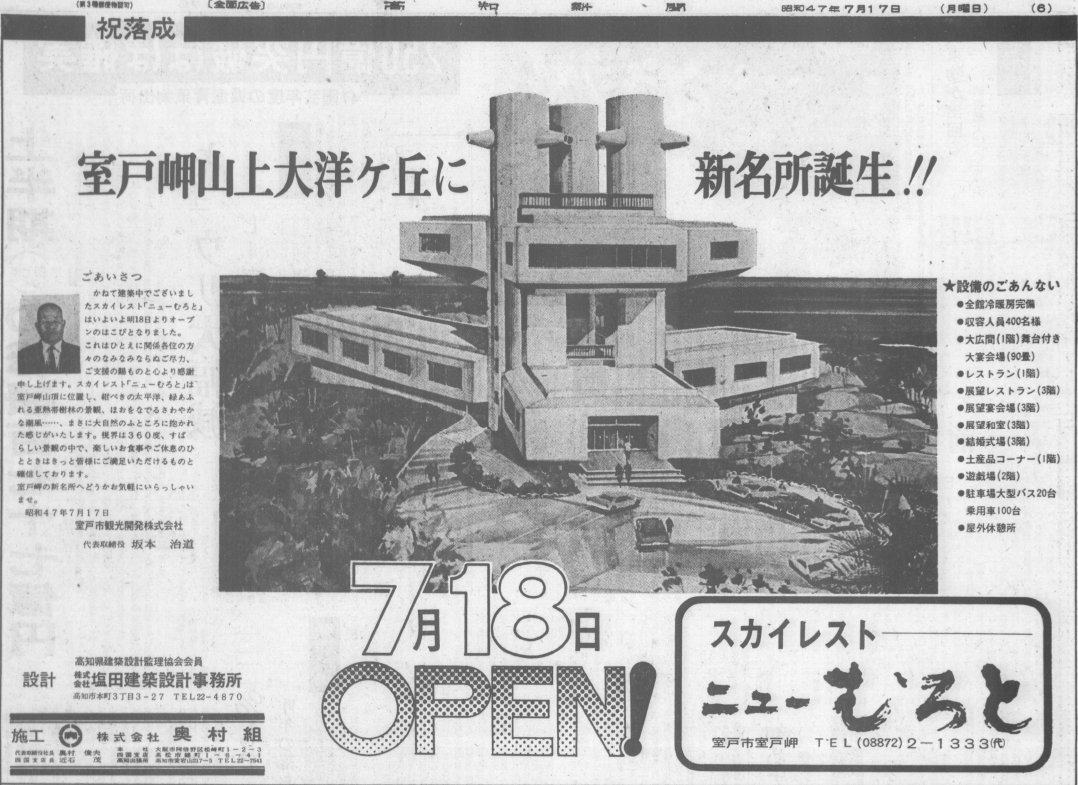 일본 시코쿠 남동쪽 끝에 있는 무로토 곶에 지어졌으나 70년대 말에 망해 문닫은 스카이 레스트 뉴 무로토 호텔. 상당히 독특한 디자인. 아래에서 보면 일본의 성 처마가 있는 것 같이 착시 효과를 주기도 한다. 얼마나 장사가 안 됐는지 운영 당시 모습이나 뉴스 기사 등이 극히 드물다.