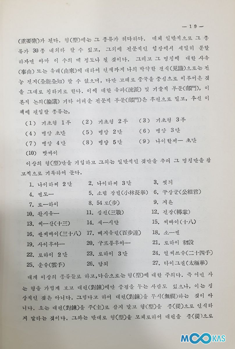 44๋ ์์ 46๋ ์ฌ์ด์ ์กฐ์ ์์ ์ฐฝ๊ดํ ๊ณต์๋็ฉบๆ้/๋น์๋ๅๆ้(๋น ์ ๋ฌด์ / ์ค๊ตญ ๊ถ๋ฒ์ ์๋ฏธ์ธ๋ฐ, ๋ ๋ค ์์ด ์นด๋ผํ ) ๋์ฅ๋ค์ด ์ฒญ๋๊ด้ๆฟค้คจ, ์ก๋ฌด๊ดๆพๆญฆ้คจ, ์ง๋๊ดๆบ้้คจ, ์ฐฝ๋ฌด๊ดๅฝฐๆญฆ้คจ, ๋ฌด๋๊ดๆญฆๅพท้คจ ๋ฑ์ด ์๊ณ , ๊ฐ์ ์์ ๋ค ์คํ์ผ์ ๊ธฐ์์ ๊ทธ๋ด๋ฏํ๊ฒ ์ด๋ฆด ๋ ํ๊ฒฌ์ ๋ฐฐ์ ๋ค๋์ง, ๋ฌด์จ ๋์ฌ๋ฅผ ๋ง๋ฌ๋ค๋์ง ๋ค์ํ๊ฒ ์ฃผ์ฅํ์ง๋ง, ๋๋ถ๋ถ ์ก๋๊ดๆพๆฟค้คจ์ผํ ์นธ ์นด๋ผํ ๋ฅผ ๋ฐฐ์ด ์กฐ์ ์ฌ๋๋ค์ด์๋ค. ํด๋ฐฉ ํ์ ํ ๋ถ์ด ์ผ์ผ๋ฉด์ ๋น์๋/๊ณต์๋ ์๋ จ์ ์๊ฐ ๋์๊ณ , ๊ทธ ์ค ์ญ์ ์ผ๋ณธ์์ ์ผํ ์นธ ์นด๋ผํ ๋ฅผ ๋ฐฐ์ด ์ตํํฌ๋ผ๋ ๊ตฐ์ธ์ด ์ด์น๋ง์๊ฒ '์ด์ ํ๊ตญ์ธ๋ฐ ์ผ๋ณธ ๋ฌด์ ์ ๊ณ์ ํด์์ผ ๋๊ฒ ์ต๋๊น. ์ฐ๋ฆฌ ๋ฌด์ ์ ๋ง๋ค๊ฒ ์ต๋๋ค.' ํ๊ณ ํ๊ถ๋๋ผ๋ ๋ช ์นญ์ ๋ง๋ ๋ค ์ด์น๋ง์, ๋ ์ด์ด์ง๋ ๊ตฐ์ฌ์ ๊ถ ์ฐ์ค์ ์ฌ์ฉํด์ ์ฌ๋ฌ ๋น์๋ ๋์ฅ๋ค์ ๊ฐ์ ๋ก ๋ณํฉํด ํ๋์ ํ๊ถ๋ ๋จ์ฒด๋ฅผ ๋ง๋ค์๋ค. ์ด ๋๊น์ง๋ ํ์๋ ๊ทธ๋ฅ ์ผํ ์นธ ์นดํๅฝขํ์ ๊ทธ๋๋ก ์ฌ์ฉํ๋ค. ๋์ค์ ๋ฐ์ ํฌ์ ์ํด ๋ง๋ ์ด์์ ๋์ฌ๋ก ์๋ช ๋ ์ตํํฌ๊ฐ ์ธ๊ต ์ ๋ฌด๋ ํฝ๊ฐ์น๊ณ ์ผํ ์นธ ๋๋์ ๋นผ๊ธฐ ์ํด ๋ค์ ์ ๋ฆฌํ ์ฐฝํ๋ฅ ํ๊ถ๋ 'ํ'์ ์์ฑํ๋ค. ํํ ๋ถํ ํ๊ถ๋๋ผ๊ณ ํ๋ ITF๊ณ ํ๊ถ๋์์๋ ์์ง๋ ์ฒ์ง, ๋จ๊ตฐ, ๋์ฐ ๋ฑ์ ํ์ ๋ฐฐ์ด๋ค. ๋ง์ฐฌ๊ฐ์ง๋ก ๋ถ๋ฏธ๋ก ์ฎ๊ฒจ๊ฐ ๋ฌด๋๊ด ๋น์๋ ๋์ฅ๋ค๋ ์์ง ํ์๊ฐ ์๋ "ํ"์ ๋ฐฐ์ด๋ค. ์ํ๋ฐฐ์ฐ ์ฒ ๋ ธ๋ฆฌ์ค๊ฐ ๋ฌด๋๊ด ๋น์๋๋ฅผ ์ค์ฐ๊ธฐ์ง์์ 18์ด ๋๋ถํฐ ๋ฐฐ์ ๋ค. ์ตํํฌ์ ์ฐฝํ๋ฅ ํ์ ์ฌ์ค ์ผํ ์นธ, ์๋๋ฅ, ์ํ ๋ฅ, ์ฐ์์น๋ฅ ๋ฑ์ ์นดํ์ ๋นํด ์๋์ ์ผ๋ก ์ผํ ์นธ์์ ์๋์ ์ผ๋ก ๋ฉ์ด์ง ๊ฒ์ผ ๋ฟ, ์ฌ์ค ์ฒ์ง ํ์ ๋ณด๋ฉด … ํ๊ตญ์ ํ๊ถ๋ ํ์์ ๋นํ๋ฉด ๊ทธ๋ฅ ์ผํ ์นธ ๋๋์ด ์์ง ๊ฐํ๋ค. ์์ ๋ค์ด ๋ฐฐ์ด ์ผํ ์นธ์์ ๊ทธ ์ ๋ ๋ฉ์ด์ง๋ฉด ๊ต์ฅํ ๋ฉ์ด์ก๋ค๊ณ ๋๊ผ์ ๋ฒํ๋ค. ๊ทธ ์์ ๊น์ง๋ ์์ง ์ค๊ตญ ๋ฌด์ ์์ ๋ฅํ๊ตญ ํ ๋ก, ํ ์์ ์ผํ ์นธ์ผ๋ก, ์ผํ ์นธ์์ ๋น์๋๋ก ์ด์ด์ง ์นดํ์ ์ฒ๋ ์ ํต์ด๋ผ๋ ๊ฒ๋ ๋ฌด์ํ์ง ๋ชปํ๋ ๊ฑด๋ฐ ๊ฑฐ๊ธฐ์ ๋ฒ์ด๋๋ ๊ฒ๋ ์ฌ์ค ํฐ ๊ฒฐ์ฌ์ ํ์๋กํ๊ธฐ ๋๋ฌธ์ ํด๋ฐฉ ํ์๋ ๋ค๋ค ์ผํ ์นธ ์นดํ๋ฅผ ๊ณ ์งํ๋ ๊ฑฐ๊ณ . ์ ์น์ ํ์ผ๋ก ๋น์๋ ๋์ฅ๋ค์ ํตํฉํด ํ๊ถ๋์ ์ฐฝ์์๊ฐ ๋์ด๋ฒ๋ฆฐ ์ตํํฌ๋ 1972๋ ์ ๋ฐ์ ํฌ์์ ๋ถํ๋ก ์บ๋๋ค๋ก ๋ง๋ช ํ๊ฒ ๋๋ค. ์ดํ 30๋ ๊ฐ ์ธ๊ณ ํ๊ถ๋ ์ฐ๋งน ํ์ฅ์ผ๋ก ์ญ์ํ๋ ๊ตฐ์ธ/์ ์น์ธ ๊น์ด์ฉ๊ณผ ๋ฐ์ ํฌ์ ์์ง๋ก ๋ํ๋ฏผ๊ตญ์ ํ๊ถ๋๋ฅผ ๋ ๋ค์ ์ฌ์ ๋ฆฌํด์ ์ตํํฌ์ ์๊น์ ์ง์ฐ๋ ์์ ์ ํ๋ฉฐ 'ํ์'๋ผ๋ ์ฉ์ด์ ์ ํ์๋ค์ ๋ง๋ค๊ณ ๋ณธ๊ฒฉ์ ์ผ๋ก ์ฌ๋ฆผํฝ์ ๋ชฉํ๋ก ๊ธฐ์ ๊ณผ ๊ฒฝ๊ธฐ๊ท์น๋ค์ ์ด์ฌํ ์ ๋ํ๋ค. ์ฌ๋ฆผํฝ ๊ฒฝ๊ธฐ๋ก ์ฑํ๋๋ฉฐ ์ ์ธ๊ณ๋ก ๋จ๋ฒ์ ๋จ์ผ ํ๊ถ๋ ์คํ์ผ๋ก ์ซ ์ ํ๋๋ค. ๋ค๋ฅธ ๋ฌด์ ๊ณผ ๋ฌ๋ฆฌ ์ฌ๋ฆผํฝ์ผ๋ก ์ฑํ๋๋ ํ๊ถ๋๋ ์ ๋ ๊ฐ์ ๋ฌด์ ์ ๋จ์ผ ์ ํ๋ง ์ด์๋จ๋๋ค. ์ฌ๋ฆผํฝ ๊ฒฝ๊ธฐ์ ์ฐธ์ฌ ๊ฐ๋ฅํ ๋์ฅ ์ธ์ ๋๋จธ์ง๋ ๊ฑฐ์ ๊ณ ์ฌ๋๋ ์์ค. ๊ฒฝ๊ธฐ ์ค์ฌ์ผ๋ก ํ๊ถ๋๊ฐ ๋ฐ์ ํ๋ฉด์ ๊ธฐ์ ๋ค๋ ๊ธฐ์กด ์ผํ ์นธ๊ณผ๋ ๋งค์ฐ ๋ฌ๋ผ์ง๊ธฐ ์์ํ๋ค. ์ฃผ๋จน ๊ธฐ์ ์ด ๊ณ ์ฌ๋๊ธฐ ์์ํ๊ณ ๋์ ๋ฐ์ฐจ๊ธฐ๊ฐ ์ฅ๋ ค๋๋ค. ์ตํํฌ ์์ ์ง์ฐ๋ค๋ณด๋ ์ผํ ์นธ ์ ์ฅ์์ ๋ณด๋ฉด ์ผํ ์นธ์์ ๊ฐ์