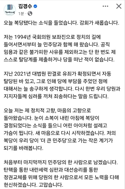 김경수의 문제는 정치감각이 0이라는 거다. 스스로 모든이의 호감을 깎아먹고 조중동을 반색하게 했던 저번 메시지에 이어 이제 "더 큰 민주당"을 만들자고 한다. 참고로 지금 더불어민주당 당원 수가 245만명이다. 김경수가 드루킹 만나고 다닌 일로 감옥에 간 2021년 이후 이재명 대표 따라 당에 들어온 당원 수가 115만 명이다. 경남지사직 날리고 민주당을 위기에 빠뜨리고, 또 당에 큰 폭탄 역할을 하겠다고 돌아오는 동안 이재명은 당을 2배로 키워놨다. 이재명은 더 큰 민주당을 만들겠다거나 하는 그런 선언 따위 하지 않았다. 그냥 했다. 온몸을 던져 검찰과 맞서고 윤석열과 맞서고 목숨을 걸고 진짜 피를 흘려가며 해냈다. 그 앞에 나선 정치초짜 김경수는 사과를 요구하고 더 큰 민주당을 만들어야 한다고 하고 있다. 남자 박지현이다.