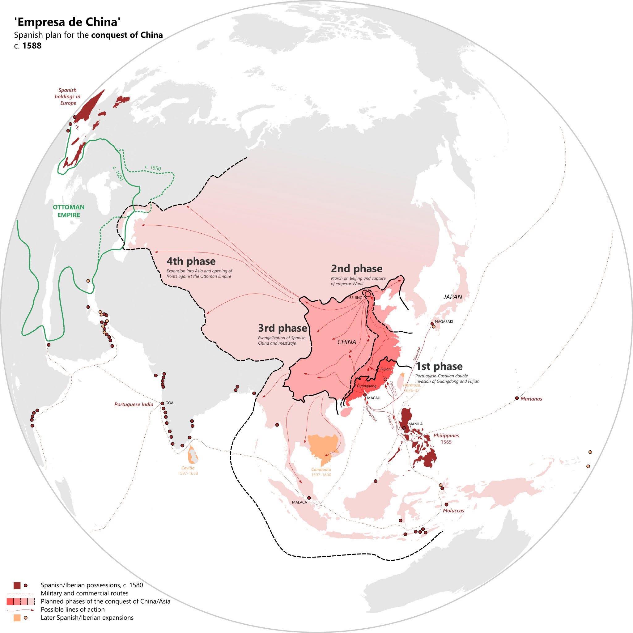 모든 제국은 세계정복을 꿈꾼다. 필리핀 정복으로 아시아에 거점을 마련한 스페인도 거기서 멈출 생각 따위는 하지 않았다. 어떻게 해야 중국을 비롯한 아시아 전체를 정복할지 계획을 세웠다. 명나라를 정복하자는 계획을 처음 제안한 건 남미 정복자로 악명 높은 에르난 코르테스였다. 겨우 몇십명의 인원으로 중남미의 제국들을 무너뜨려본 경험이 있던 코르테스는 중국도 같은 방식으로 정복할 수 있을 거라고 생각했다. 거기에 일본을 우군으로 끌어들여 중국을 나눠갖는다는 계획이었다. 현실에서는 중국은 그 규모가 차원이 달랐고 아시아에서도 스페인의 앙숙 포르투갈과 경쟁하느라 큰 팽창은 어려워서 곧 이 1588년 Empresa de China 계획은 폐기 됐다. 그러나 중국 정복이라는 화두를 포기하지 않은 일본은 1592년 가도입명(假道入明)이라는 우리에겐 황당하게 느껴졌던 명분으로 조선을 침략한다. 결국 명은 커녕 조선 침략에도 실패했으니 일찍 포기한 스페인이 똑똑한 것일 수도 있고, 혹은 임진왜란 때 왜와 스페인 연합군을 상대로 싸울 뻔한 것이기도 하다.