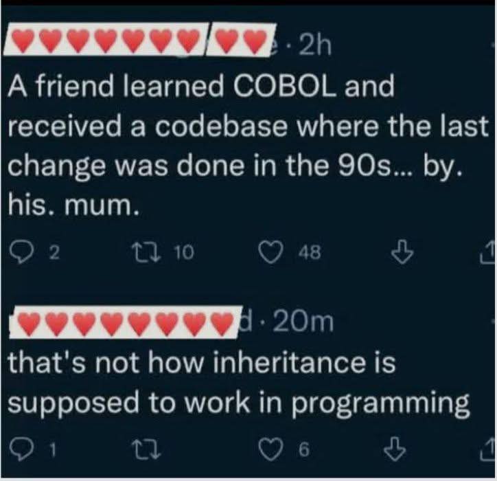 ”친구가 코볼 배워서 유지할 코드베이스를 받았는데 마지막으로 수정한 게 90년대고 마지막 수정자가 걔 엄마야.“ “클래스 상속을 그렇게 하는 게 아닌데.”