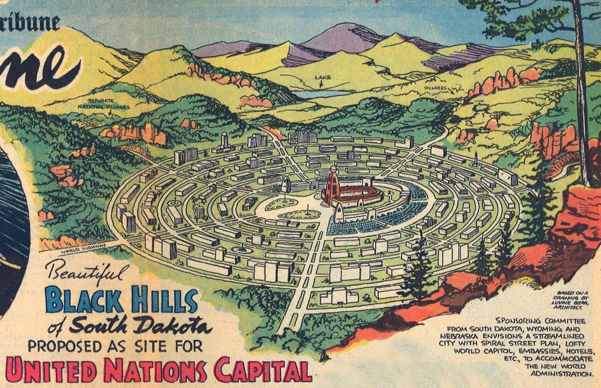 트럼프에 의해 유명무실해지고 있는 UN. 출범 초에는 미국 주도의 새 세계 질서를 확립하고 유지하기 위해 만들어졌다. 당연히 본부도 미국에 둬야했다. 아예 이탈리아 안의 바티칸 시티처럼 독립된 도시 규모의 영토와 국적까지 고려했던 것 같다. 미국 내 여러 지역들이 후보지로 뽑혔고 다양한 계획들이 만들어졌었으나, 첫 석유 재벌 존 D 록펠러가 뉴욕 맨해튼 6번가에 가지고 있던 땅을 기부하면서 그냥 거기로 결정됐다. 여러 기획안 중 사우스 다코타 블랙 힐스라는 곳 기획안.