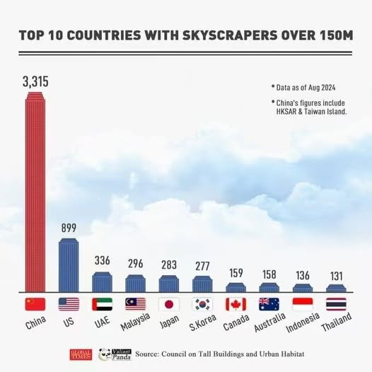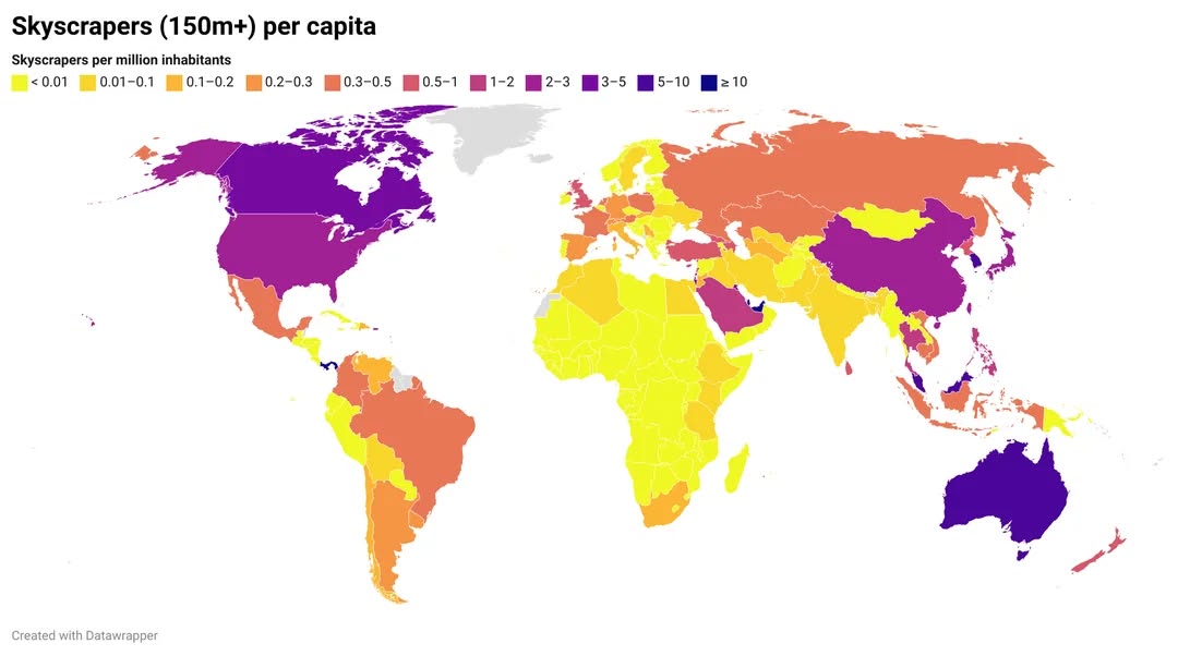 한국은 고층빌딩 수에서 세계 6위. 인구당 고층빌딩 수로는 9위. 인구 천만 미만 국가를 제외하면 3위. 백만명 당 고층빌딩 수: UAE – 36.09 Monaco – 25.61 Qatar – 19.58 Singapore – 16.39 Panama – 15.45 Bahrain – 12.05 Malaysia – 8.72 Australia – 5.82 South Korea – 5.37 Kuwait – 3.64 인구 천만 이상인 국가에서 백만명 당 고층빌딩 수: Malaysia – 8.72 Australia – 5.82 South Korea – 5.37 Canada – 3.55 Israel – 3.15 United States – 2.65 Japan – 2.24 China – 2.23 Taiwan – 2.09 Thailand – 1.90