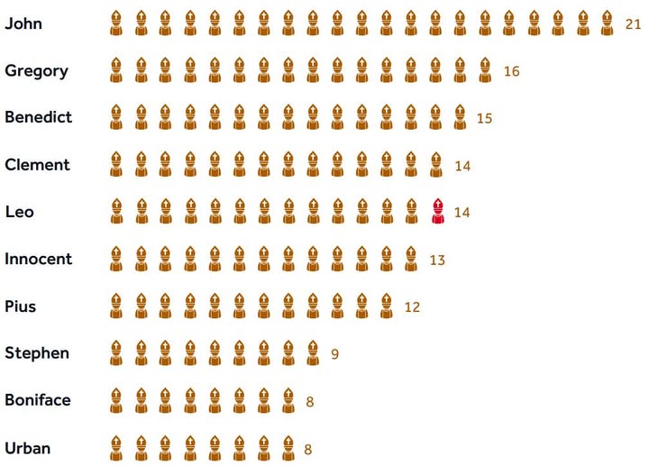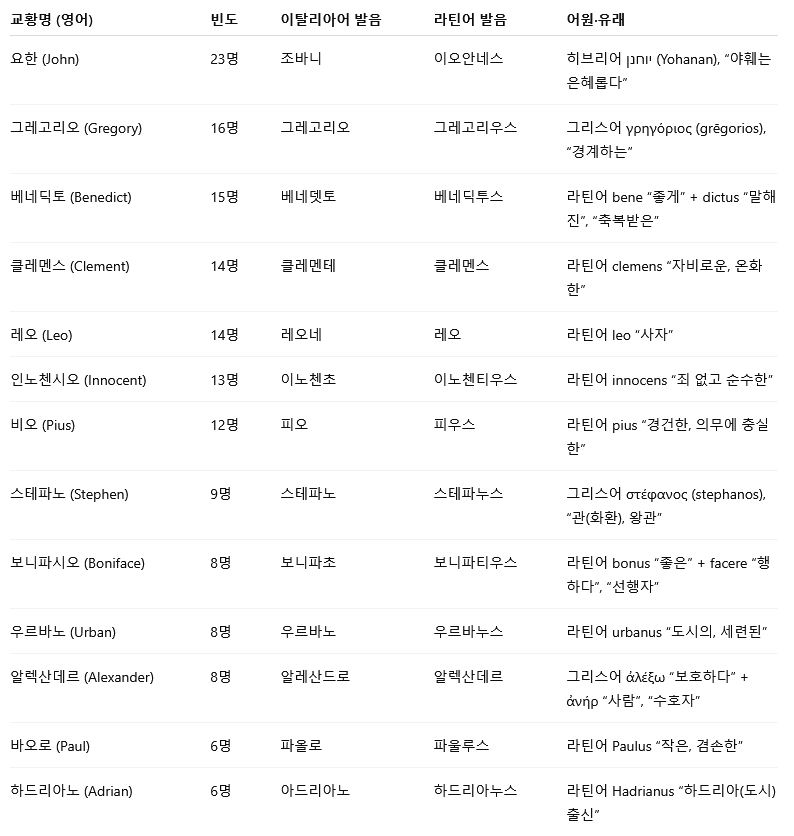 교황명 (빈도) 이탈리아어 발음 라틴어 발음 어원·유래 요한 (John) (23명) 조바니 이오안네스 히브리어 יוחנן (Yohanan), “야훼는 은혜롭다” 그레고리오 (Gregory) (16명) 그레고리오 그레고리우스 그리스어 γρηγόριος (grēgorios), “경계하는” 베네딕토 (Benedict) (15명) 베네뎃토 베네딕투스 라틴어 bene “좋게” + dictus “말해진”, “축복받은” 클레멘스 (Clement) (14명) 클레멘테 클레멘스 라틴어 clemens “자비로운, 온화한” 레오 (Leo) (14명) 레오네 레오 라틴어 leo “사자” 인노첸시오 (Innocent) (13명) 이노첸초 이노첸티우스 라틴어 innocens “죄 없고 순수한” 비오 (Pius) (12명) 피오 피우스 라틴어 pius “경건한, 의무에 충실한” 스테파노 (Stephen) (9명) 스테파노 스테파누스 그리스어 στέφανος (stephanos), “관(화환), 왕관” 보니파시오 (Boniface) (8명) 보니파초 보니파티우스 라틴어 bonus “좋은” + facere “행하다”, “선행자” 우르바노 (Urban) (8명) 우르바노 우르바누스 라틴어 urbanus “도시의, 세련된” 알렉산데르 (Alexander) (8명) 알레산드로 알렉산데르 그리스어 ἀλέξω “보호하다” + ἀνήρ “사람”, “수호자” 바오로 (Paul) (6명) 파올로 파울루스 라틴어 Paulus “작은, 겸손한” 하드리아노 (Adrian) (6명) 아드리아노 하드리아누스 라틴어 Hadrianus “하드리아(도시) 출신”