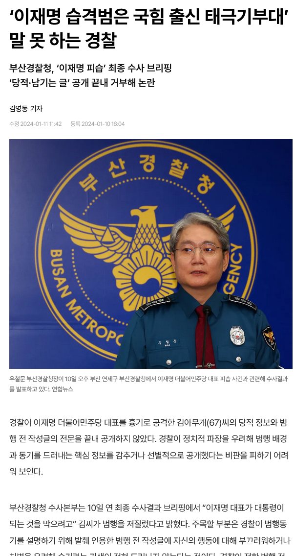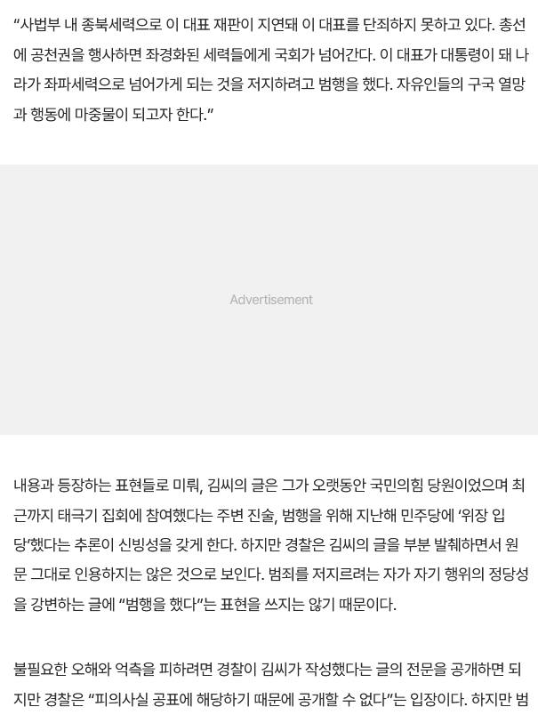 “사법부 내 종북세력으로 이 대표 재판이 지연돼 이 대표를 단죄하지 못하고 있다. 총선에 공천권을 행사하면 좌경화된 세력들에게 국회가 넘어간다. 이 대표가 대통령이 돼 나라가 좌파세력으로 넘어가게 되는 것을 저지하려고 범행을 했다. 자유인들의 구국 열망과 행동에 마중물이 되고자 한다.” 감히 먼저 움직인 헌재 때문에 정권을 잃게 생겼으나 이재명은 자기가 막으면 된다며 나선 대법원 조희대의 인식과 일치한다고 본다.