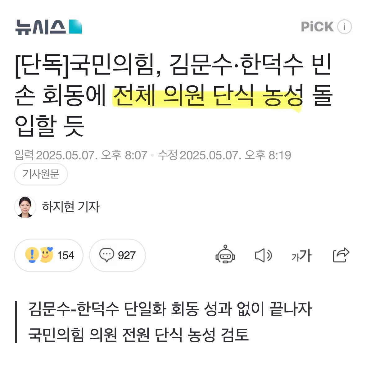 재미있긴 한데 우린 이거 2002년에 후단협이랑 이미 다 똑같은 순서로 겪어 봐서.. 1. 노무현 민주당 대선후보로 당선 2. 새 후보를 경계하는 민주당 꼰대들이 정몽준이 지지율 더 높으니 단일화하자며 후보 흔듬. 3. 당시 악역이던 김민석 의원이 민주당 탈당해서 정몽준 캠프로 감. 4. 후보단일화협의회 후단협이 생기고 내부에서 노무현 압박. 5. 결국 노무현의 승부수로 노무현으로 단일화. 결과: 정몽준은 마지막 순간에 배신. 단일화 무효라고 주장. 오히려 이게 노무현측 결집을 일으켜 간신히 승리. 후단협은 해체되고 상당수가 한나라당으로 이동. 김민석 의원 사실상 몇년 전까지 정계은퇴. 지금 김문수 후보로 당선됐고(1), 흔들고 있는 중(2). 한덕수는 당이없지만 두권이 거기 대리인처럼 일하고 있는 상황(3). 당에서도 상당수가 전당대회하자며 압박(4). 근데 지금 국힘은 (5)의 결과가 어떻게 되건 현실에서는 아무런 의미가 없는데 저러고 있다는 게… …. 우리 때는 감동의 드라마였고 그렇게 해서 집권을 했는데 여긴 희극임.