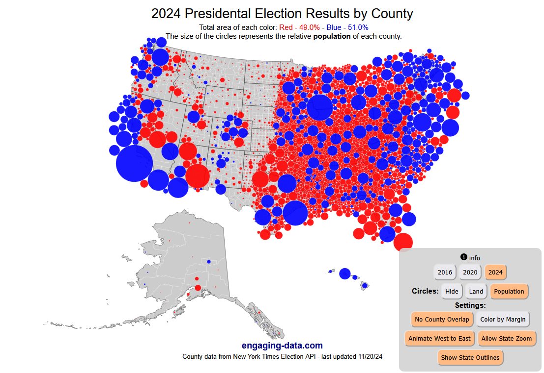 2024년 미 대선 결과를 지자체별로 인구부피로 표현하면 이렇게 됨. 사람이 모여사는 도시는 대부분 민주당. 시골에 넒게 넒게 흩어져 사는 사람들은 공화당.