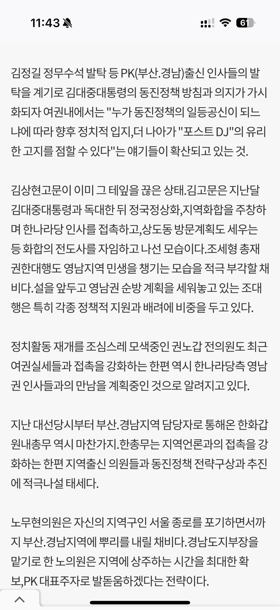1. 중도보수 선언 2. 부산경남 지지율 박빙 3. PK 인사들 진영 이동이 수월해짐 4. 총선에서 PK 의석 탈환 5. 경북으로 진격 이제 2까지 왔음. #동진정책