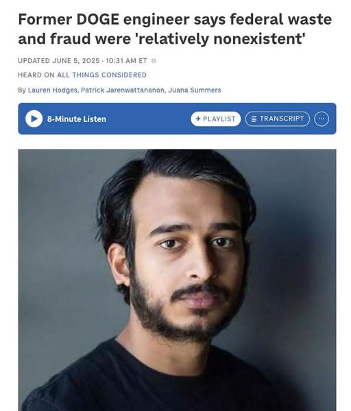 이쯤되면 일론 머스크가 이번달에 트럼프 행정부에서 빠진 것도 더 쉽게 설명 됨. 실제로 들여다볼 기회를 얻기도 전에 정부는 비효율과 낭비 덩어리라고 먼저 단정해놓고 미리 큰소리 떵떵 쳤는데 효율화 할 낭비와 사기를 찾지 못하자 슬그머니 도망간거거나, 약속했던 것과 달리 결과를 내놓지 못하니 트럼프 행정부에서 밀려났거나. 찾았다고 발표했던 낭비라는 것들도 아마 사기.