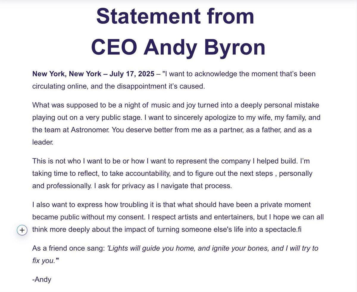 애스트로노머 라는 데이타 인프라 회사 사장이 콜드플레이 콘서트 갔다가 무대 카메라에 잡혔는데 하필 회사 인사책임자인 애인이랑 왔다가 딱 들켜서 지금 사과문 발표하고 난리.