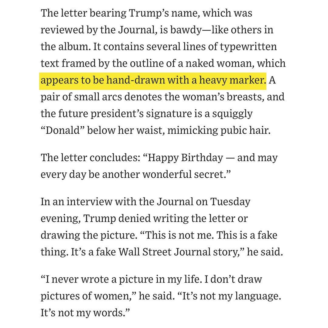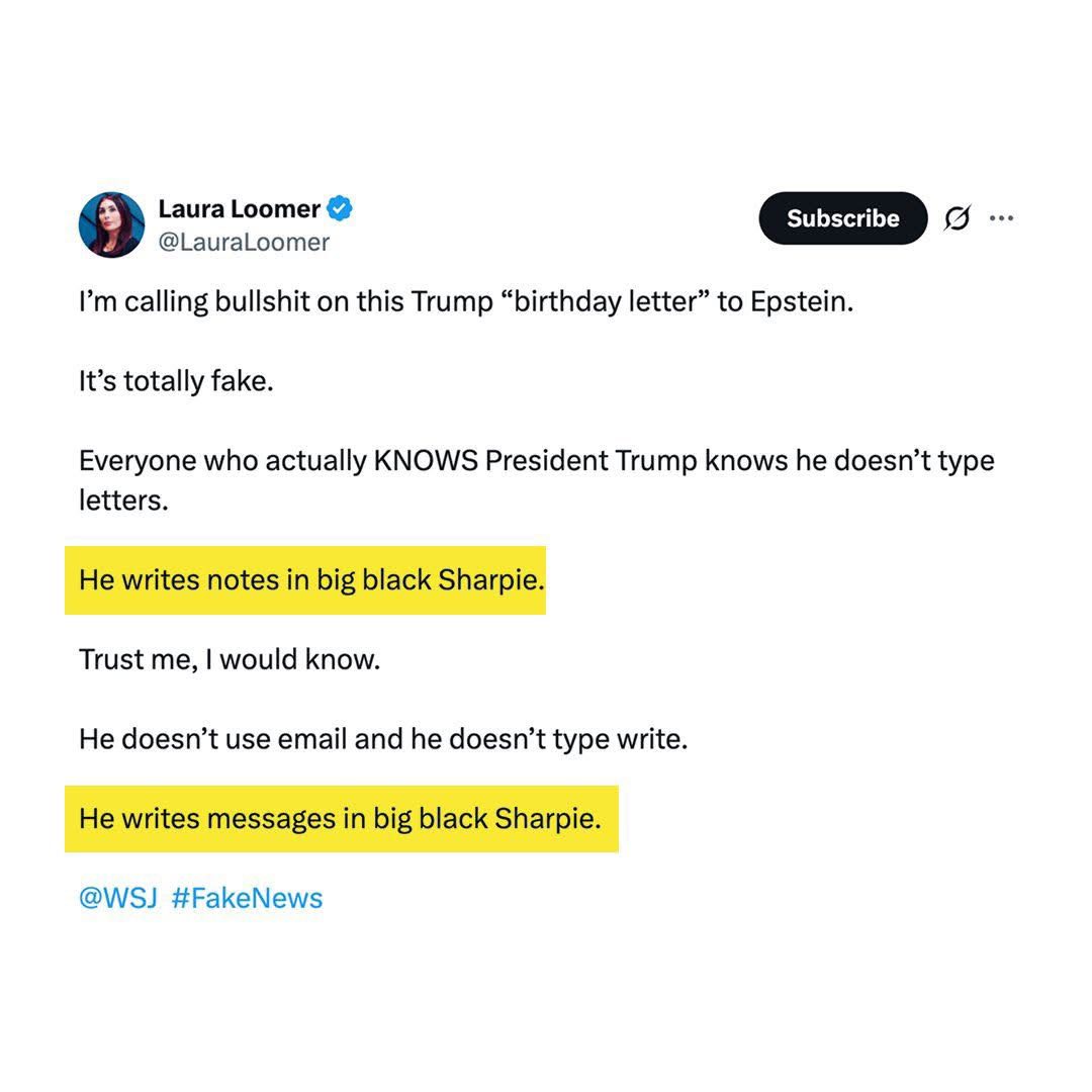 트럼프가 엡스틴에게 보낸 생일축하 카드가 발견돼서 더 곤란해진 상태. 측근이 옹호하기 위해 “트럼프 대통령은 편지나 카드에 타이핑하지 않는다. 항상 마커로 손글씨로 적는다”라고 주장.