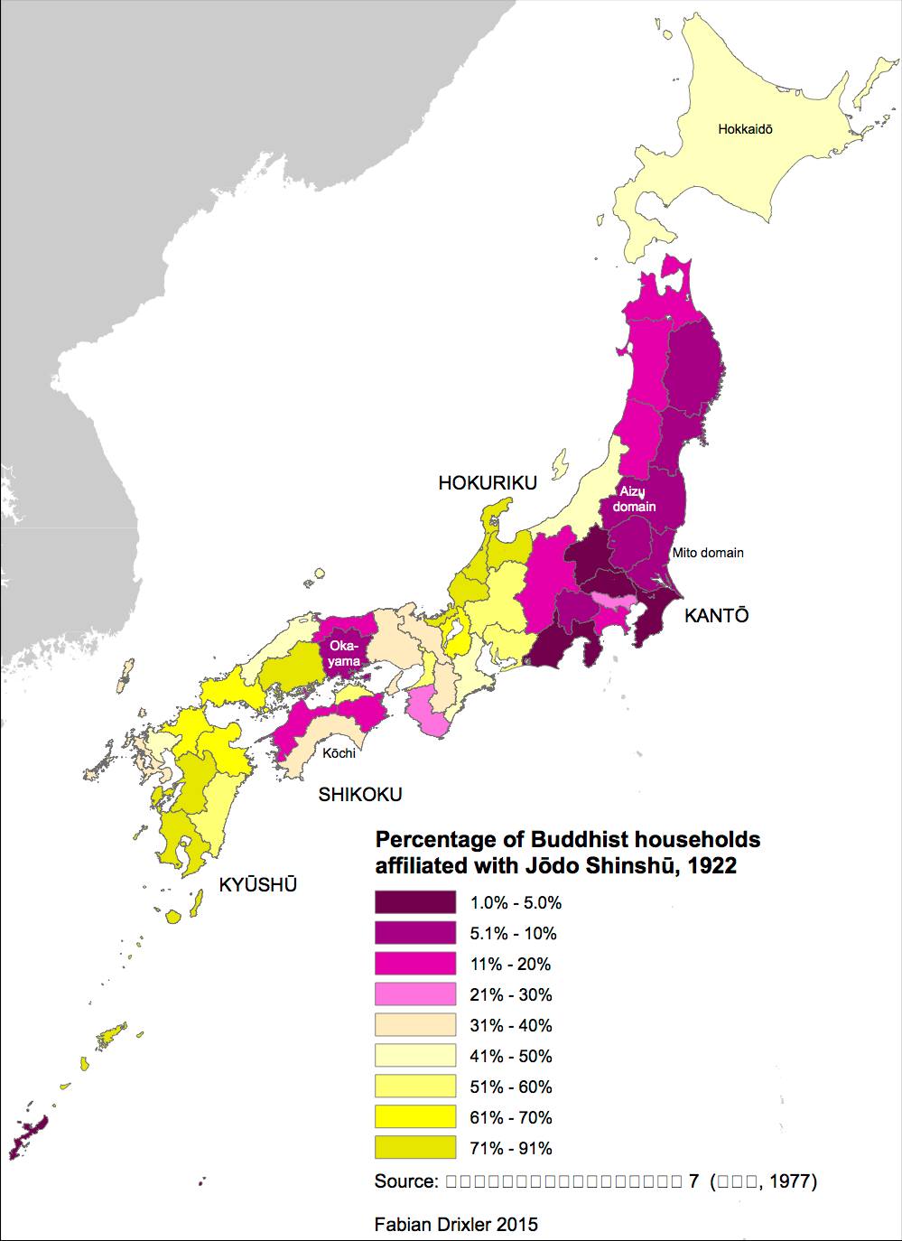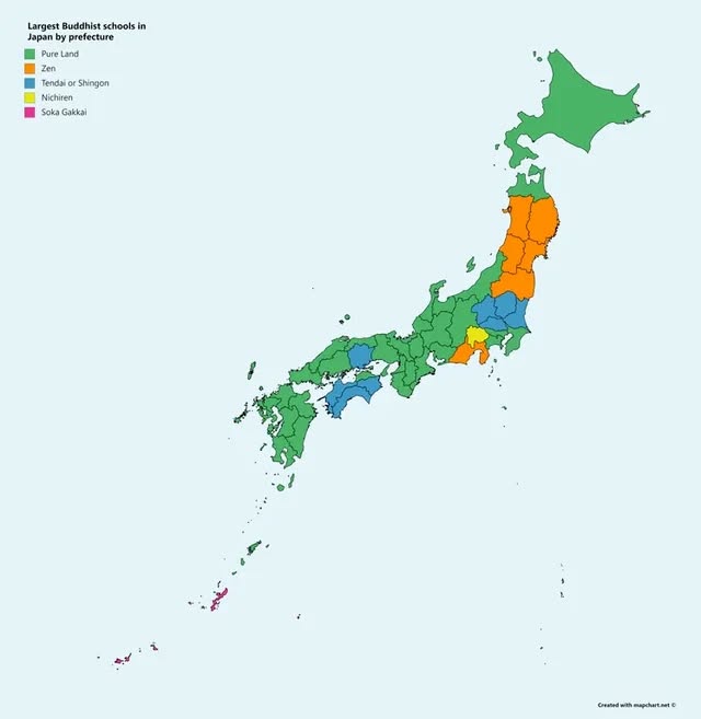신토(神道)는 일본 전국에서 고르게 퍼져 있으며 지역별 편차가 거의 없다. 사이비라고도 불리는 신흥 종교들은 조직적으로는 활발하지만 전체 인구에서 차지하는 비율은 낮다. 일본에서 지역별로 분포가 뚜렷하게 나뉘는 것은 불교 종파들이다. 일본에서 가장 세력이 큰 불교 종파는 단연 정토진종(浄土真宗, じょうどしんしゅう)이다. 신란(親鸞)이 1224년에 (가마쿠라 중기) 창시한 이 종파는 전국에 약 4,800만 명의 자칭 신도를 보유하며, 불교계 전체의 절반 가까이를 차지한다. 특히 홋카이도(北海道), 호쿠리쿠(北陸), 긴키(近畿) 지역에 강세를 보이고, 오타니파(大谷派)와 혼간지파(本願寺派)로 양분되어 있다. 신란은 정토종(浄土宗, じょうどしゅう) 승려 호넨(法然)의 제자였고, 스스로 환속하여 결혼한 재가 불자로서 살아가며 염불만으로 구원받는다고 설파했다. 이 재가 중심의 불교는 일본의 장례문화와 결합해 강력한 대중 기반을 형성했다. 한국 불교에는 없는 절대 타력 의존적 신앙이며, 결혼한 승려가 일반화된 독특한 체계를 가지고 있다. 정토진종의 모체인 정토종은 호넨이 1175년에 (헤이안 말기) 창시했다. 신도 수는 약 600만 명이며 전국적으로 퍼져 있으나 정토진종만큼 지역적 집중도는 크지 않다. 호넨은 천태종(天台宗, てんだいしゅう) 출신으로, 오직 나무아미타불 염송만으로 구원이 가능하다고 주장했고, 이는 기존 수행 중심 불교에 대한 파격적 대안이었다. 정토진종과 달리 출가한 승려는 결혼하지 않는다. 한국 불교는 염불을 수행 일부로 보지만, 정토계열처럼 그것만으로 구원을 단정하지 않는다. 니치렌계(日蓮系)는 신도 수만 보면 약 1,000만 명 이상으로 정토종보다 많다. 1253년에 (가마쿠라 중기) 일련종을 창시한 니치렌(日蓮, にちれん)은 평민 출신으로, 천태종에서 출가해 법화경(法華経) 이외 모든 경전을 배척하며 ‘남묘호렌게쿄(南無妙法蓮華経)’만을 염송하도록 했다. 주요 기반은 도쿄(東京)와 가나가와(神奈川)를 포함한 간토(関東) 지역에 있으며, 신도 수는 많지만 정통 불교 교단 체계 내에서의 교세나 사찰 수로 보면 정토계보다 약하다고 보는 시각도 있다. 이 계열에서 현대에 들어 창가학회(創価学会, そうかがっかい) 같은 신흥 세력이 출현했고, 전후 일본 정치에도 강한 영향력을 미쳤다. 자민당 정권의 공동정부 파트너 공명당(公明党)이 창가학회의 정당이다. 특히 창가학회는 오키나와(沖縄)에서 전국에서 가장 강력한 지지 기반을 형성하고 있다. 교리적으로는 가장 배타적이며, 정치성과 대중 동원력이 강하다. 한국 불교와 달리 강한 교조성과 선민의식을 갖는 점이 뚜렷하게 이질적이다. 조동종(曹洞宗, そうとうしゅう)은 도겐(道元)이 1227년 (가마쿠라 초기) 중국 조동선에서 배워온 좌선 중심의 선종이다. 신도 수는 약 530만 명이지만, 사찰 수는 일본에서 가장 많다. 도호쿠(東北) 지방과 지방 소도시에 널리 분포한다. 특징은 오직 좌선만을 수행으로 삼는 ‘지관타좌(只管打坐)’ 전통이며, 공안이나 언어적 개입 없이 조용한 참선을 중시한다. 한국 조계종과는 선 수행이라는 점에서 유사하지만, 한국은 임제종 기반이라 공안이 핵심인 반면 조동종은 수행 방식이 훨씬 단순하고 묵묵하다. 임제종(臨済宗, りんざいしゅう)은 에이사이(栄西)가 1191년에 (가마쿠라 초기) 중국에서 들여온 선종으로, 조동종보다 언어적 방편과 공안 수행에 무게를 둔다. 신도 수는 약 450만 명으로 조동종과 유사하며, 전국적으로 퍼져 있으나 수도권보다는 간사이(関西) 이남에서 흔하다. 좌선과 선문답이 균형을 이루며, 선 수행과 무도, 다도 문화와의 연결이 깊다. 한국 조계종과 가장 유사한 계열이지만, 일본에서는 정토계열에 밀려 대중성은 상대적으로 약하다. 진언종(真言宗, しんごんしゅう)은 밀교 계통으로, 구카이(空海)가 816년 (헤이안 초기) 당나라에서 밀교를 배워 돌아와 일본식 밀교로 정착시켰다. 신도 수는 약 550만 명이며, 고야산(高野山)을 중심으로 긴키와 시코쿠(四国) 지역에서 강세다. 주술과 진언, 만다라, 불화, 불상, 호마(火供) 등의 화려한 의식 중심 전통은 한국 불교에선 거의 사라진 요소들이다. 특히 국가 제사와 결합한 경향이 강하며, 실용적인 치병과 복을 비는 목적도 뚜렷하다. 천태종은 사이초(最澄)가 806년에 (헤이안 초기) 창시했으며, 신도 수는 약 280만 명으로 비교적 적지만 교리적 기반은 깊다. 후쿠시마(福島)나 이바라키(茨城) 등 간토 북부와 도호쿠 일부 지역에 영향력이 있다. 원융불교를 지향하며, 선·염불·계율·밀교를 통합적으로 이해한다. 정토종과 니치렌종의 창시자 모두 천태종 출신일 정도로 많은 종파의 원류가 된다. 한국 천태종과 교리적으로 유사하지만, 일본에서는 전통 지식 중심 종단에 가까우며 대중화에는 성공하지 못했다. 전체적으로 한국 불교에 비하면 수행보다 염불에 초점이 맞춰져있다. 정토진종 외에는 모두 출가 승려의 독신을 강조했으나 메이지 유신 이후 신불분리 정책에 의해 모든 승려의 결혼이 가능해졌고 실제로 승려 가문에 의해 사찰이 대를 이어 자녀들을 통해 교육/승계/유지되는 경우가 있다