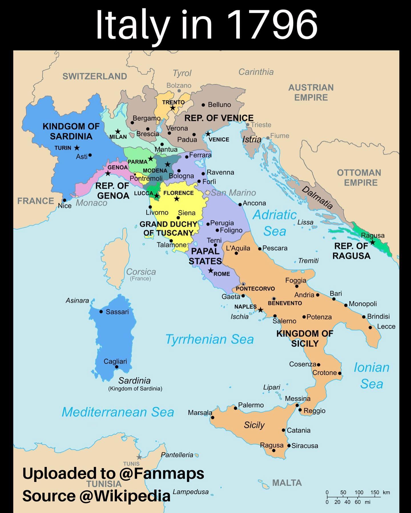이탈리아라는 나라는 사실 존재하기 시작한지 오래 되지 않았다. 로마 제국이 무너진 후, 이탈리아 반도는 천 년 넘게 수많은 도시국가, 왕국, 교황령, 외세의 점령지로 나뉘어 있었고, 그 안에 사는 사람들은 자신을 ‘이탈리아인’이라기보다 나폴리 사람, 피렌체 시민, 베네치아 상인처럼 지역 중심으로 인식했다. "이탈리아"라는 말은 있었지만, 어디까지나 요동 반도의 요동처럼 지리적 개념에 가까웠다.