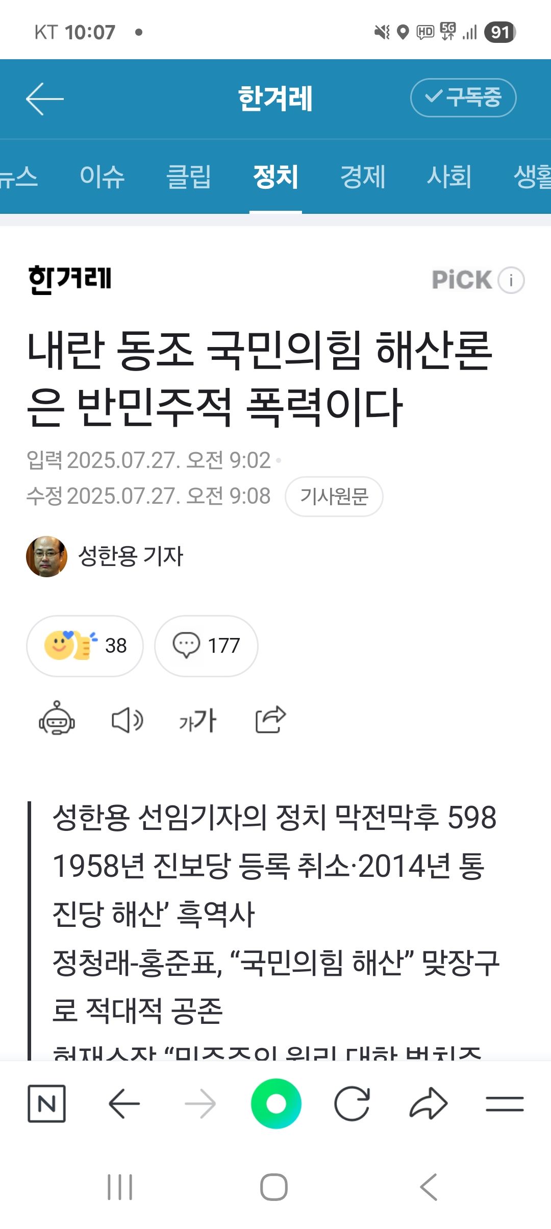 왜냐하면 이재명을 정치개혁에서 막아야지 다음은 언론개혁일 게 뻔하거든. 성한용 이빨에겐 국힘이 입술인 것.