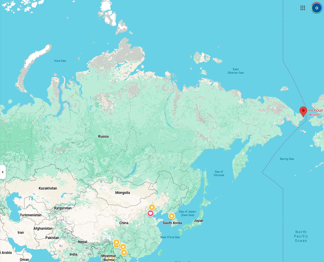 Инчоун Inchoun 러시아 북동 끝단에도 인천이 있다. 어원은 현지사람들 말뜻으로 "베인 코"라 하는데 인초운… 해서 인천처럼 들린다. 저기 개발하러 가자. 새로운 화물선들이 저기 돌아 북극으로 넘어가기 직전 쉬다 가는 곳을… 보아하니 얕은 물 같으니 어디 해상 시설을 건축하던가 해야겠지만. 어쨌건. 여기 저기 정박지가 될만한 곳 구글지도로 보고 있는 난 오늘은 복부인 모드.