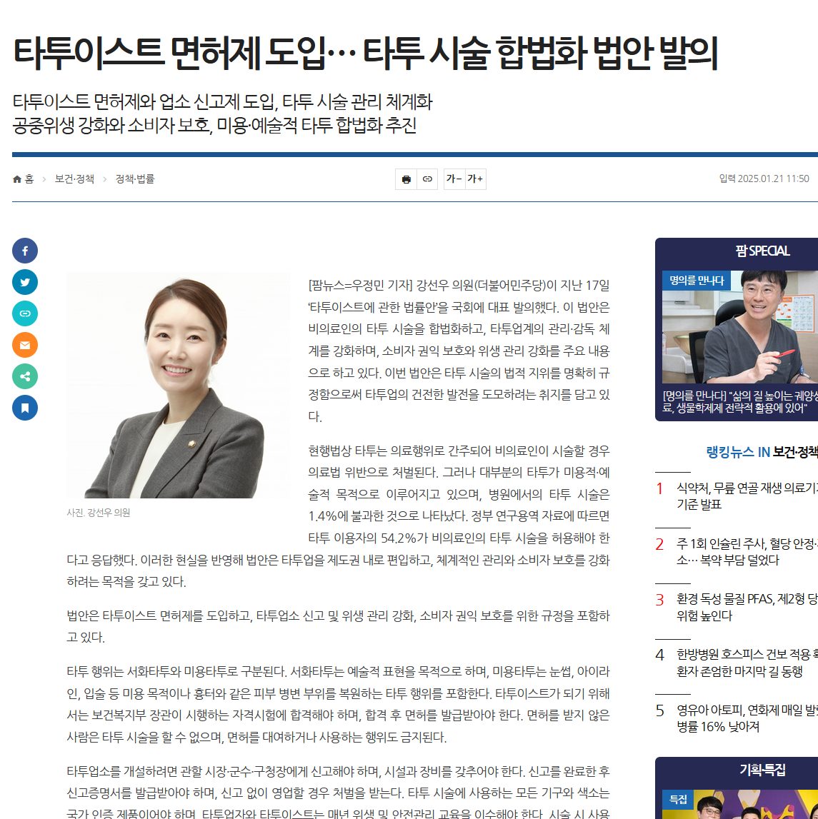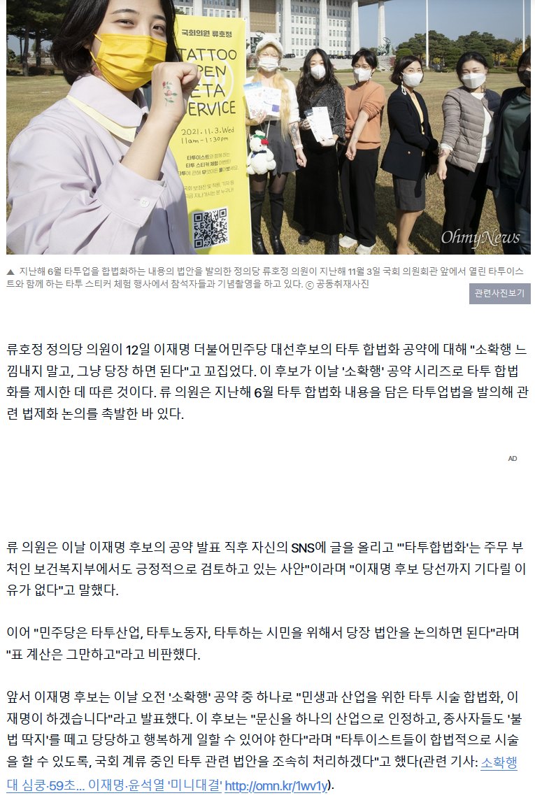타투합법화를 위한 투쟁 기치를 올리며 화려하게 중앙일보 기사에 오른 2021년 정의당 류호정 의원. 이재명 후보가 그 제안에 긍정적으로 반응하며 함께 통과시키자고 하자 필요없다고 민주당 혼자 하라고 쏘는 2022년 류호정 의원. 보통 사회통념보다 많이 앞서는 법안은 일부 진보세력이 요구하고 거대 민주당이 끌려가는 형식으로 통과된다. 앞에 요구하며 끌고가는 세력이 없으면 어차피 강하게 저항할 국힘과 협상해야 할 법안이 많은 민주당의 투쟁력이 분산되고 법안은 표류한다. 그래서 저 법안은 여당이 된 국힘의 방해로 사라졌다. 반면 거대중도보수당 민주당이 진보정당과 협업할 때는 꽤 막강한 시너지가 발생한다. 민주당을 향한 색깔론은 옆에 진보주의자이기를 부끄러워하지 않는 진보정당 때문에 무의미해지고 민주당은 보수 유권자를 공략하며 자신감을 갖는다. 민주노동당과 그래서 궁합이 좋았다. 지금은 조국혁신당과 그 관계를 만들어가는 중이다. 민생법안이건 진보법안이건 대한민국 국회에서 통과되는 법안 압도적 다수는 민주당이 발의해서 통과시킨다. 국힘은 발의보다 주로 막는 게 일이라서 비교하면 민주:국힘이 6:4, 7:3 정도 된다. 극히 일부가 정의당 등에서 발의하고 민주당이 지원하는 식으로 통과됐었다. 소수 진보정당 소속 의원 입장에서 자신의 염원인 법안에 민주당 대선 후보가 동참하겠다고 접근해온다… 그럼 축배를 들어야하는 상황이다. 근데 민주당 의석이 없이는 단 한 번도 발의한 법안이 통과된 적 없는 당인 정의당의 의원이 자기 법안에 관심 보이는 민주당을 비웃는다…? 그럼 이제 민주당에서 자기 법안에 찬성하는 사람들은 설득이나 감사가 아니라 비웃음 받고 찬성표를 내줘야 하는 입장. 타투합법화를 염원했던 수많은 사람들은 류호정의 배신을 보고 어떻게 생각했을까. 2025년에 제대로 된 타투합법화 법안이 발의됐다. 발의자가 강선우 의원이었다. 자기 지역구에도 성폭력피해자 돕는 기관인 해바라기센터를 법에 규정된대로 개설해달라고 요구했다가 장관에게서 갑질한다는 소리를 듣고 여성계와 진보측에게서 전면적인 비토를 받고 낙마한 강선우 장관 후보. 한국의 진보는 자기들 밥그릇 건드는 민주당 굉장히 싫어한다. '진보'도 아닌 게 진보가 주장할 일을 먼저 해결해버리는 민주당. 한국의 소수약자는 약자로 남아줘야 진보도 먹고 사는데.