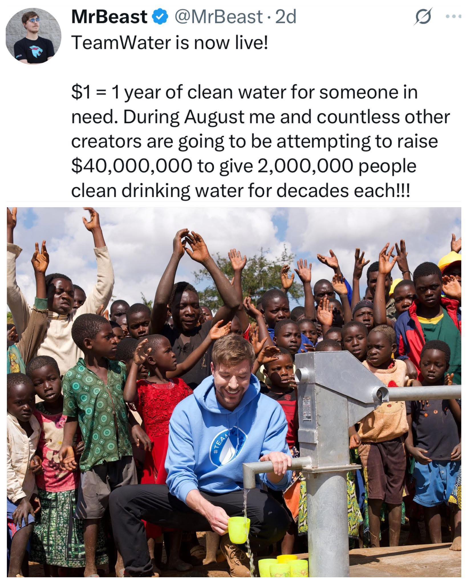 미스터 비스트가 2백만 명이 10년간 물을 마실 수 있는 양의 식수를 공급해보겠다고 선언. 아마도 우물을 파…