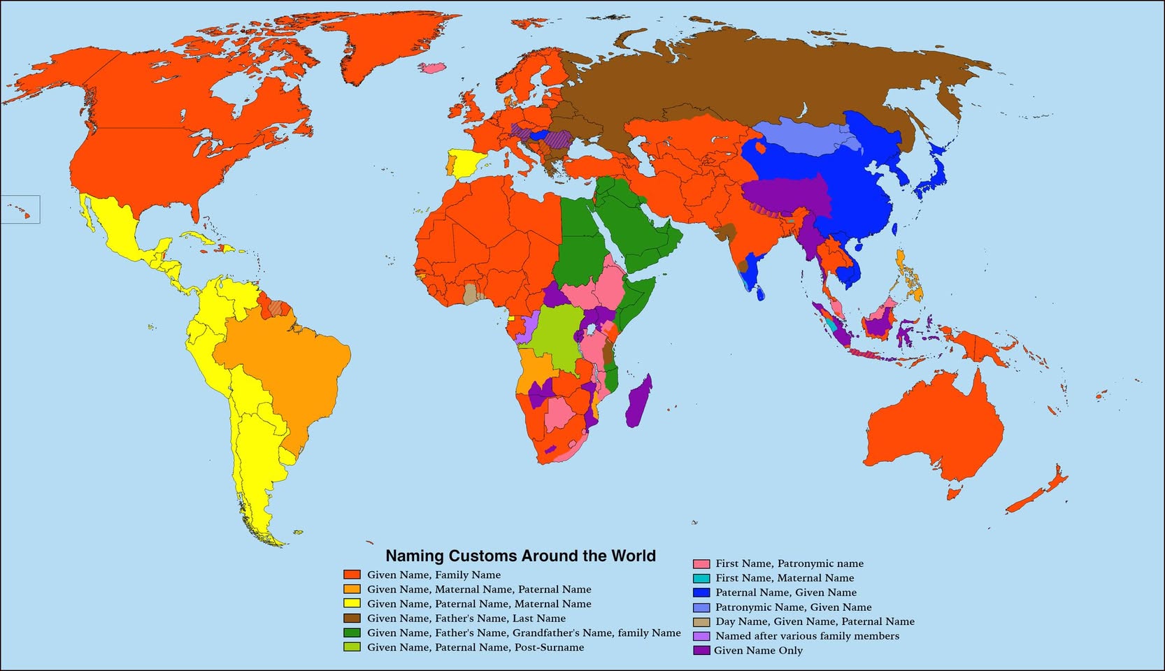 사실 동양식 "성 + 이름"이나 서구식 "이름 성" 이름 체계가 생각보다 보편적이지 않다. 인도네시아, 버마, 티베트는 아직 성을 거의 사용하지 않는다. 태국은 성씨가 생긴지 약 110년 밖에 안됐다. 1913년 처음으로 의무화 됐고, 그 전까지는 이름 + 별명으로 구분했다. 라마 6세가 서구식 국가 체제를 도입하면서 식별 수단으로 성씨 제도를 법제화했다. 각 가문이 서로 다른 성씨를 사용하도록 강제했기 때문에 수만개의 굉장히 많은 성씨가 생겨났다. 구성은 "민호 김" 이런 식인데, 별명 문화가 있다. 태어날 때 짧고 기억하기 쉬운 별명을 부여받는다. 콜라, 아이스같은 짧은 영어 단어 이름도 많이 쓴다. 본명은 너무 길어서 일상에서 잘 안 쓴다. 개명이 법적으로 쉽고 흔하다. 운세에 안맞는다는 견해를 들으면 개명한다. 이름을 바꾸는 게 액막이 의미가 있고, 평균 평생 2-3번 바꾼다고 한다. 본명은 가족만 알고 남들에게는 별명만 알려주는 경우가 많아서 개명해도 모른다. 몽골 이름은 "철수의 아들 민호" 이런 식이라 가문의 고정된 성씨가 대대로 이어지지는 않는다. 아이슬란드도 "민호 철수son" 혹은 딸이면 "민희 철수dottir" 하는 식으로 성으로는 아버지 이름만 알 수 있다. 남인도는 "김 민호" 북인도는 "민호 김"으로 쓴다. 러시아는 "민호 철수vich 김" 이런 식으로 자신 이름, 아버지 이름 표기, 다음에 성씨를 붙인다. 고정된 성씨가 이어진다. 스페인과 라틴아메리카는 "민호 김(아버지 성) 정(어머니 성)" 패턴을 따른다. 포르투갈, 브라질, 필리핀은 "민호 정 김" 패턴을 따른다. 필리핀은 포르투갈 방식을 따르려고 따른 건 아니고 이름 중간이름 성씨 패턴을 자유롭게 쓰다가 미국령이 되면서 표준화하는 과정에 중간이름으로 어머니 성을 넣는 풍습이 생겼다. —- 한반도에서 성씨를 쓰기 시작한 기록은 삼국시대부터 나타난다. 4세기 고구려 소수림왕 때부터 귀족 집단이 성을 가졌다고 기록된다. 고려때 중국식 제도를 본격적으로 받아들이기 시작했다. 조선 시대에 점점 확대되다가 1894년 갑오개혁 때 신분제가 폐지되면서 전국민이 성을 가질 수 있게 됐다. 일제시대 때 호적 제도가 도입되면서 성이 없는 사람은 새로 만들거나 주변인 성씨를 받아 등록했다. 일본도 5세기 무렵 야마토 왕권 때 씨족(氏族)과 관위(官位) 제도를 정비하면서 성씨를 쓰기 시작했다. 이때는 아직 성이라기 보다 귀족 지위를 나타내는 칭호였다. 11세기 헤이안 시대에 무사집단이 성씨를 쓰기 시작했다. 19세기 에도 막부가 끝날 때까지 인구의 90%였던 평민은 성씨 사용이 금지됐다. 대부분 농민은 이름 + 촌락명을 사용했다고 한다. 1870년 메이지 유신 이후 성씨 사용이 의무화 됐고 제한없이 각자 작명해서 신고하도록 했기 때문에 지명, 직업, 자연물 등을 따서 성씨로 삼았다. 같은 동네에서도 다른 집안끼리 서로 다른 성씨를 쓰려는 경향이 있어서 30만종의 성씨가 생겼다. 지금도 20만종의 성씨가 남아있다. 중국은 전설시대부터 춘추전국 시대까지 성은 모계 혈통을, 씨는 후대에 가문에서 분파된 집단을 나타내는 표기로 사용됐었다. 한나라 시절에 지금같은 성씨 개념이 생겼지만 아직 사용이 보편화 되지는 않았다. 대부분 이름만 있었고 성은 없었다. 수당 시절에 다수가 성씨를 사용하기 시작했고 10-12세기 송원시대에 사실상 전국민이 성씨를 사용했다. —- 한국은 본관(本貫), 파(派), 돌림자(行列字) 등으로 더 세분화된 가문 구분을 하는데, 사실 중국에서 온 풍습이다. 돌림자도 송대에 생긴 전통이었다. 족보(族譜)를 편찬하는 풍습도 마찬가지로 송대에 생겨났다. 문화대혁명때 족보 등이 없어졌다가 1980년 개혁개방 이후 다시 쓰기 시작한 집안들도 있다. 한국에서 돌림자 사용 방식도 위치를 고정해 매번 앞자가 같거나 매번 뒷자가 같은 경우가 있고, 세대마다 돌림자의 위치를 바꿔 쓰는 방식이 있다. 돌림자 한자의 부수(部首)를 음양오행에 맞춰 항렬자로 돌려 쓰는 방식이 가장 널리 쓰인다. 일부 가문에서는 시나 문구를 미리 정해놓고 각 글자를 세대별 항렬자로 쓴다. 중국은 돌림자를 쓰는 경우 가훈(家訓)이나 가시(家詩)를 세대마다 한 글자 씩 돌려 쓴다. 대부분 앞자에 쓰고 뒷자를 자유롭게 붙인다. 덕목이나 자연요소를 사용해서 德, 孝, 忠, 義, 山, 江, 松, 海, 같은 돌림자가 많다. 한국도 비슷하다. 중국은 부수를 활용하는 경우는 별로 없다. 역시 한국보다 돌림자를 지키는 집안 비율은 매우 낮다. 일본은 사실 본적, 파, 돌림자 풍습이 없다. 족보를 기록하지 않기 때문에 자신이 누구의 몇대째 후손인지 확인할 길은 거의 없다. 단지 각 지역의 사찰이나 신사가 신도 명부에 기록해놓는 경우가 있어서 수백년 전 조상의 장례 기록을 찾을 수 있는 경우가 있다. 명문가는 족보를 관리하는 경우가 있다. 도쿠가와(德川), 아시카가(足利) 가문 후손들은 아직도 족보를 관리한다. 옛날에도 상급 무사 계급은 족보를 기록했지만 하위 무사들은 별로 신경 쓰지 않았다 한다. 베트남도 본적, 파, 돌림자, 족보가 있었으나 프랑스 식민지, 사회주의 혁명을 거치며 전통이 거의 다 단절됐다. 사실 유럽 대부분은 로마시절에 이