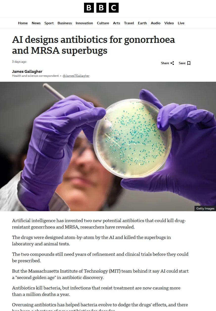 항생제가 더 이상 듣지 않는 특정 균에 대해 생성형 AI로 3600만개의 항생제 조합을 만들고 테스트해서 효과 있는 조합을 이미 찾았다. 생쥐를 감염시키는 균을 가지고 실험했을 때는 효과가 있었고 인간 임상 시작은 아직 2년 정도 앞두고 있다. AI가 인류에게 닥친 문제들 대부분을 해결할 것으로 생각한다.