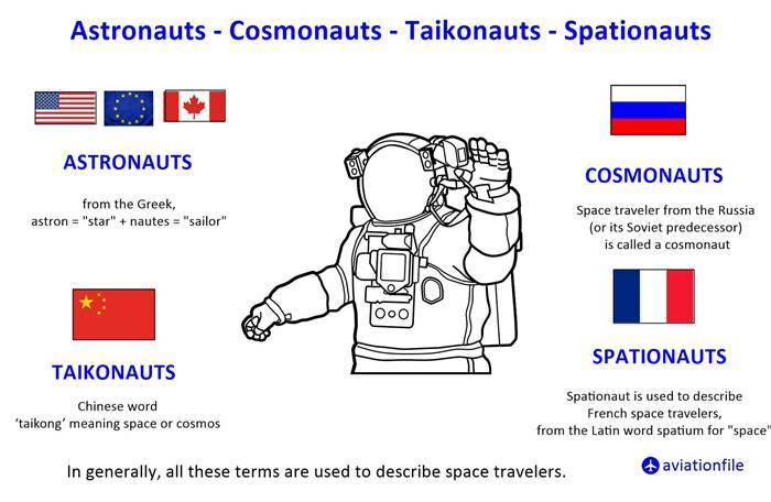 러시아 우주인은 코스모놋 cosmonaut 미국 우주인은 애스트로놋 astronaut 중국 우주인은 타이코놋 taikonaut 미소 우주 유인 우주 탐사 경쟁 때문에 언론이 용어 통일이 안되고 각자 용어를 쓰게 된 부분이 있고… 미국 언론이 우주 경쟁을 다루며 그냥 "소련의 astronaut은…" 이라고 하면 될 걸 굳이 "소련의 cosmonaut은" 이라고 러시아어 어휘를 써서 생긴 전통이다. 예를 들면 우리말을 하는데 한국책은 책이라고 쓰고 중국책은 서書라고 하고 일본책은 본本이라고 다르게 부르면 이와 비슷해진다. 아무 쓸데없는 짓이다. 코스모스가 우주고 아스트로가 별이니 이게 전통이 되어버려 중국 우주인도 태공太空 을 써서 타이코놋이라고 했다. 유럽도 보통 astronaut이라고 하는데 불어로는 spationaut 이라서 유럽우주국 우주인을 spationaut라고 부를 때도 있다. 사실 러시아에서는 러시아 우주인이건 미국 우주인이건 kosmonavt이라고 부르고 중국에서도 전부 航天员항티엔유엔, 항천원이라고 호칭한다. 인도도 곧 유인 로켓 발사를 할텐데 일부에서 인도 우주인은 vyomanaut 로 부르고 있다한다. vyoman이 산스크리트어로 하늘, 우주라는 뜻. naut 은 원래 그리스어 nautes, 행해사, 선원이라는 뜻. 그럼 200여개 국가가 유인 우주인 보낼 때마다 새로운 단어를 만들어 붙이겠다는 뜻이다. 언제까지 하려고 그러나. 중국에서는 항천원을 쓰지만 일본과 한국은 우주인 宇宙人을 쓴다. 중국어로 우주인이라고 하면 외계인 느낌이다. 대만 홍콩에서는 태공인도 많이 쓴다 한다.
