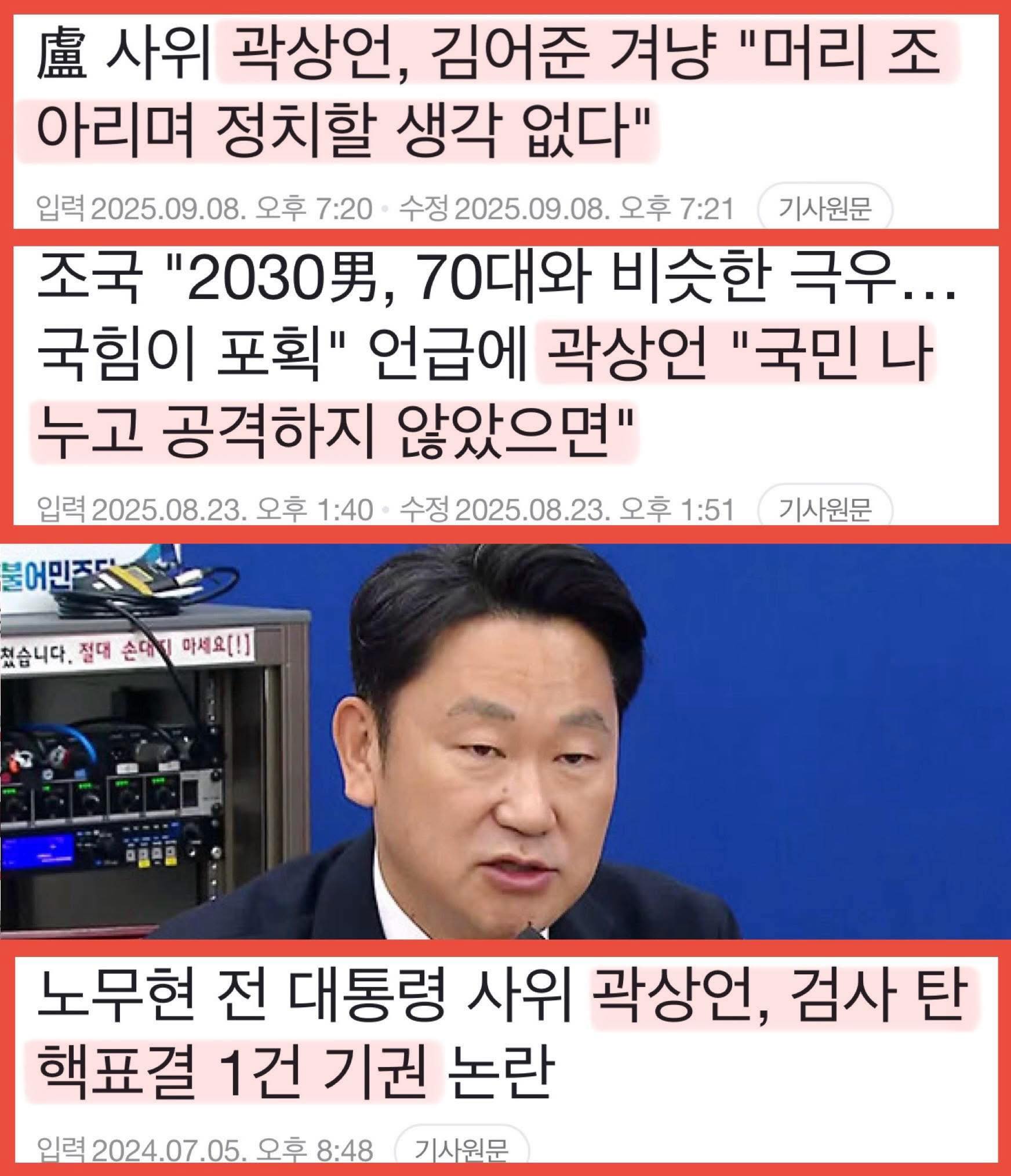곽상언은 재미있는 인물이다. 장인 노대통령 서거 후 대한민국에서 아마 유일하게 3년 간 검은 양복 검은 넥타이만 착용하며 상을 치룬 김어준을 혐오한다. 특별한 이유는 없다. 의원들이 너무 많이 출연해서라고 한다.